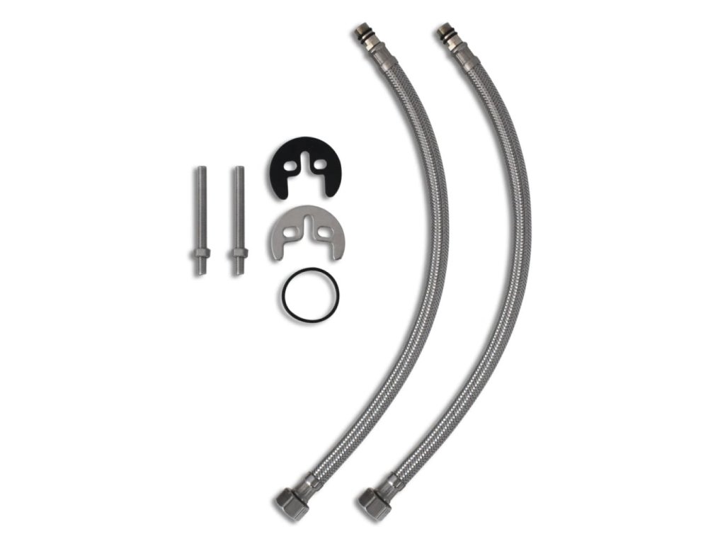 Balení obsahuje 2 baterie, 4 nerezové flexibilní hadice a montážní příslušenství.