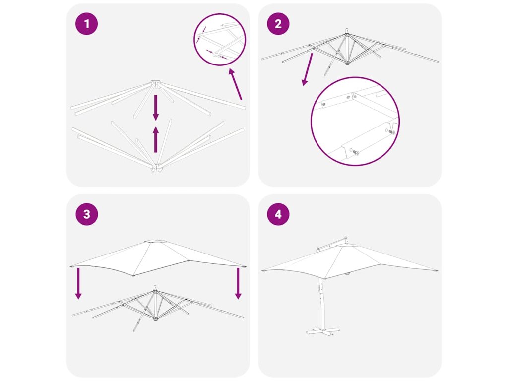 - Stabilní rám: Zahradní slunečník má robustní křížovou základnu, která zvyšuje jeho stabilitu. Pevná tyč z masivního tvrdého dřeva spolu s 8 odolnými žebry činí tento zahradní slunečník velmi stabilním a odolným.