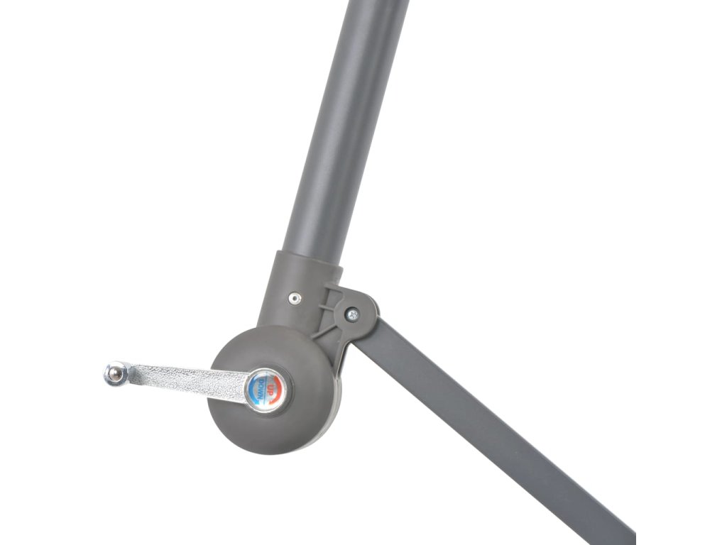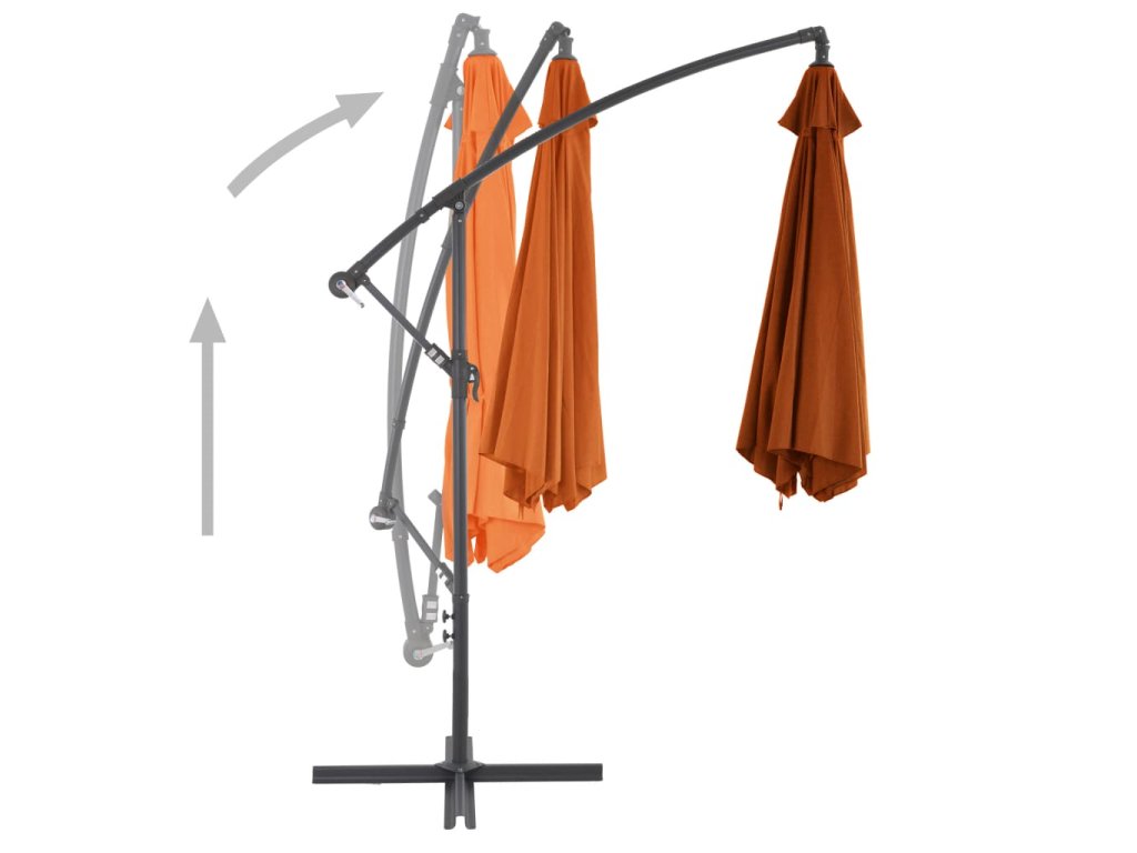 Stříška slunečníku je vyrobena z polyesterové tkaniny, která nepropouští škodlivé UV záření a nevybledne, a poskytne vám optimální ochranu před sluncem. Navíc se snadno čistí. Slunečník je vybavený pevnou křížovou základnou pro větší stabilitu. Exkluzivní konstrukce tohoto slunečníku vám umožní naklonit ho tak, aby blokoval slunce, které klesá za obzor. Silná kovová tyč se 6 odolnými žebry zajišťuje, že se slunečník nehýbe a hodně toho vydrží. Tento zahradní slunečník disponuje klikovým mechanismem, což znamená, že se snadno otevírá i zavírá.