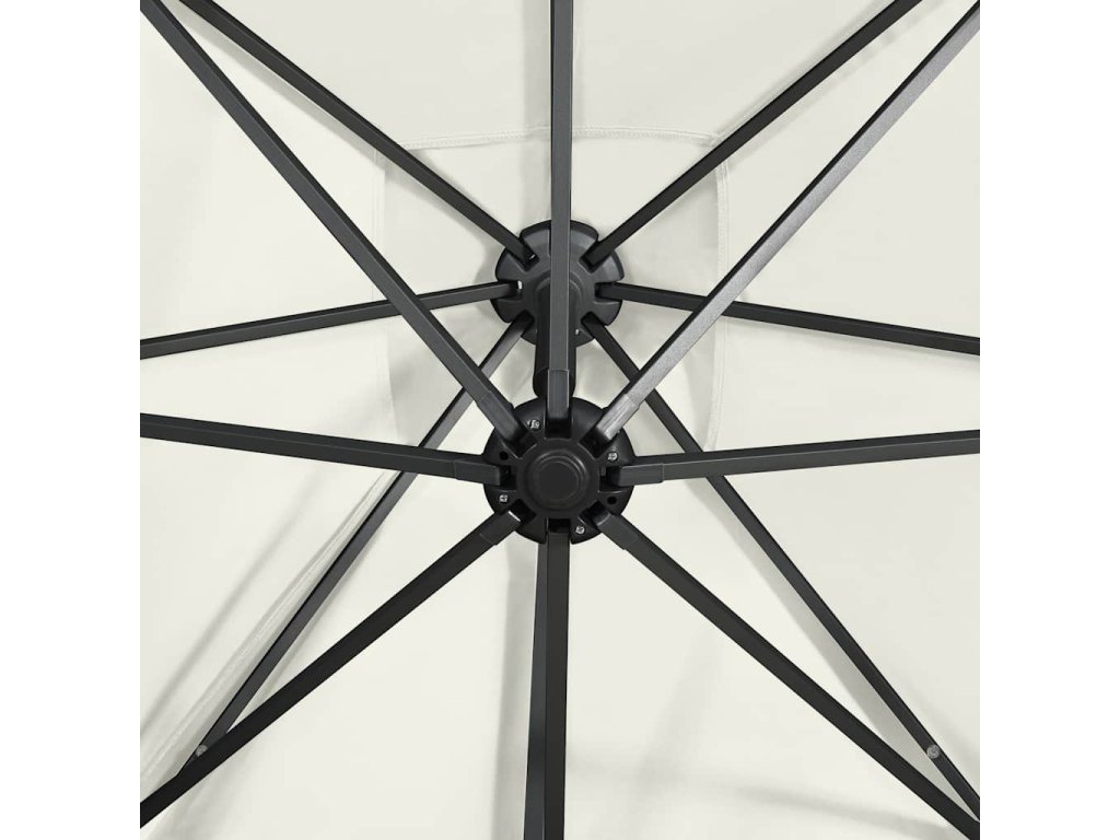 Potah slunečníku je vyrobený z neblednoucího polyesteru chránícího před UV zářením a poskytuje vám optimální ochranu před sluncem a snadno se čistí. Slunečník je vybaven pevnou křížovou základnou, která zaručuje lepší stabilitu. Exkluzivní konstrukce vám umožní zahradní slunečník naklánět a otáčet o 360 stupňů, aby blokoval slunce v jakémkoli úhlu. Silná hliníková tyč s 8 žebry slunečníku zajišťuje stabilitu a dlouhou životnost. Náš zahradní slunečník disponuje klikovým mechanismem, což znamená, že se snadno otevírá i zavírá. Terasový slunečník rovněž disponuje 24 LED světly, která po západu slunce osvětlí váš venkovní prostor a vytvoří romantickou atmosféru.