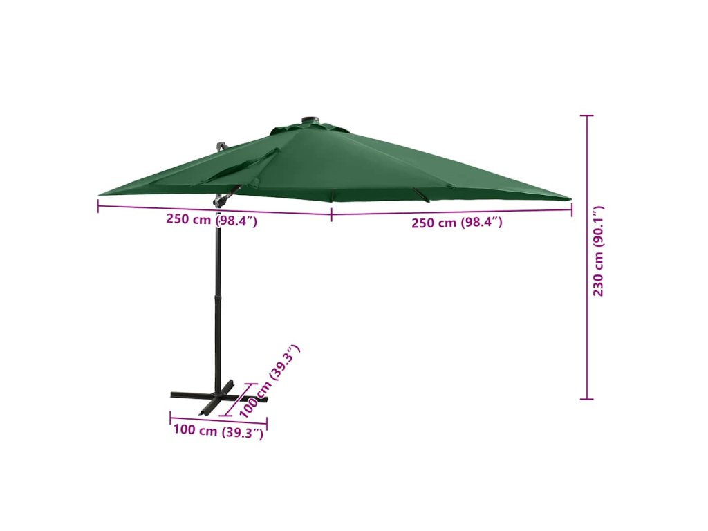 Tento elegantní boční zahradní slunečník s LED světly je skvělou volbou, která vám poskytne stín, a ochrání vás tak před sluníčkem a jeho škodlivým UV zářením. Když zapadne slunce, LED diody osvětlí váš venkovní prostor.