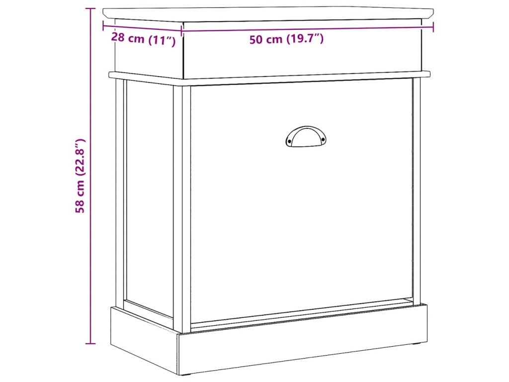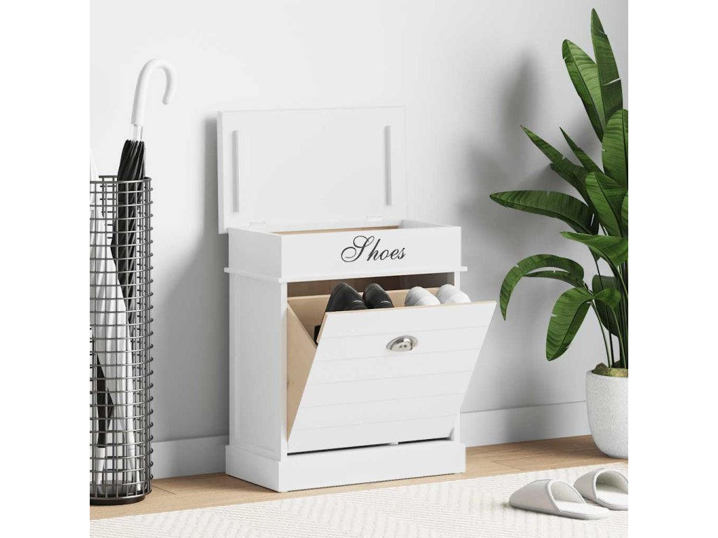 Skříňka je vyrobena ze dřeva pavlovnie, je tedy mimořádně odolná a stabilní. Velká vyklápěcí přihrádka je opatřena příčnými tyčemi, aby vše zůstalo na svém místě. Horní deska botníku se navíc dá odklopit, takže si do horní přihrádky můžete uschovat různé doplňky k obuvi, jako jsou tkaničky, vložky do bot a další maličkosti. Sestavení našeho botníku je snadné.
