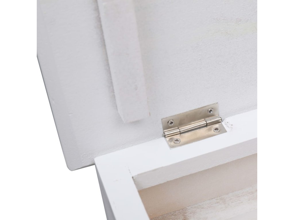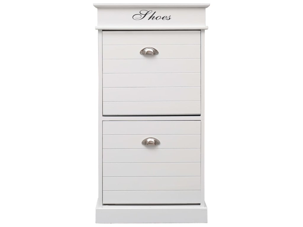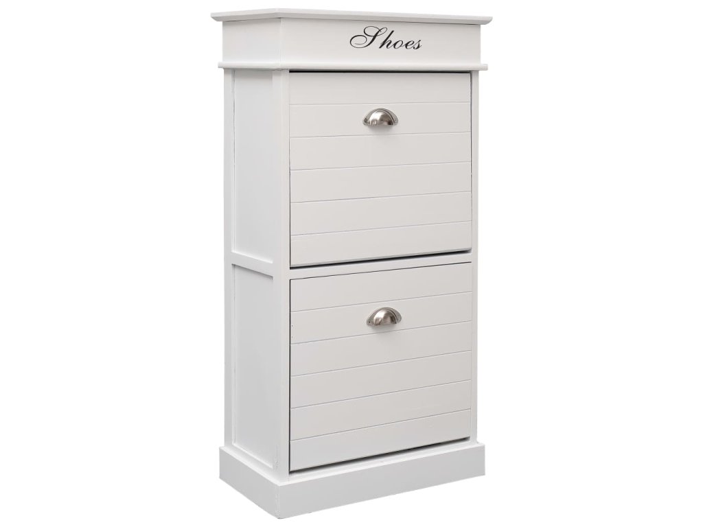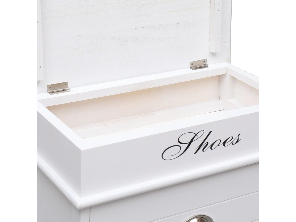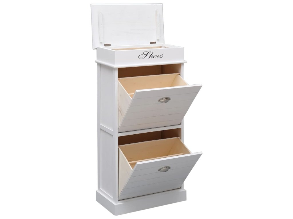 Skříňka je vyrobena ze dřeva pavlovnie, je tedy mimořádně odolná a stabilní. Dvě velké vyklápěcí přihrádky jsou opatřeny příčnými tyčemi, aby vše zůstalo na svém místě. Horní deska botníku se navíc dá odklopit, takže si do horní přihrádky můžete uschovat různé doplňky k obuvi, jako jsou tkaničky, vložky do bot a další maličkosti. Sestavení našeho botníku je snadné.