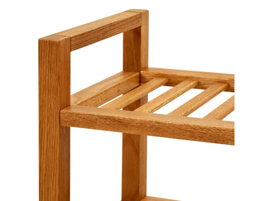 Tento dřevěný botník byl precizně vyroben z odolného masivního dubu a je velmi funkční. Vzhledem ke svému kompaktnímu designu a rukojetím zabere jen velmi málo místa a dá se snadno přemisťovat. Otevřené police jsou ideální pro dobré větrání vašich bot. S tímto botníkem už se nebudete muset rozčilovat, že máte boty rozházené po celém domě.