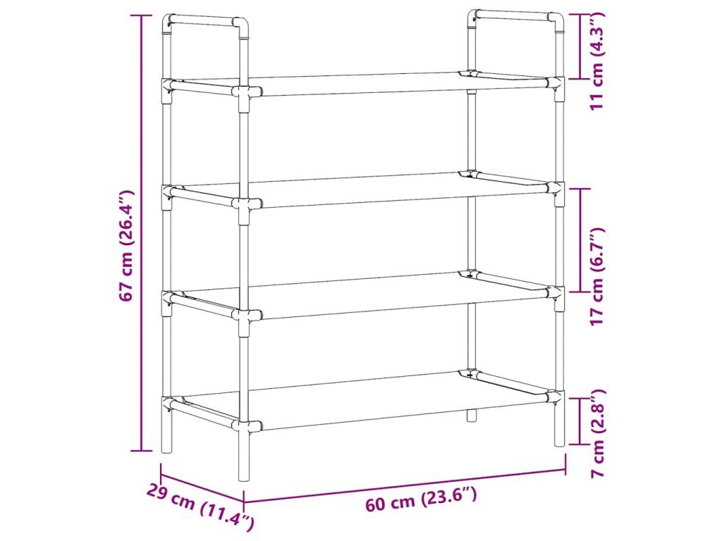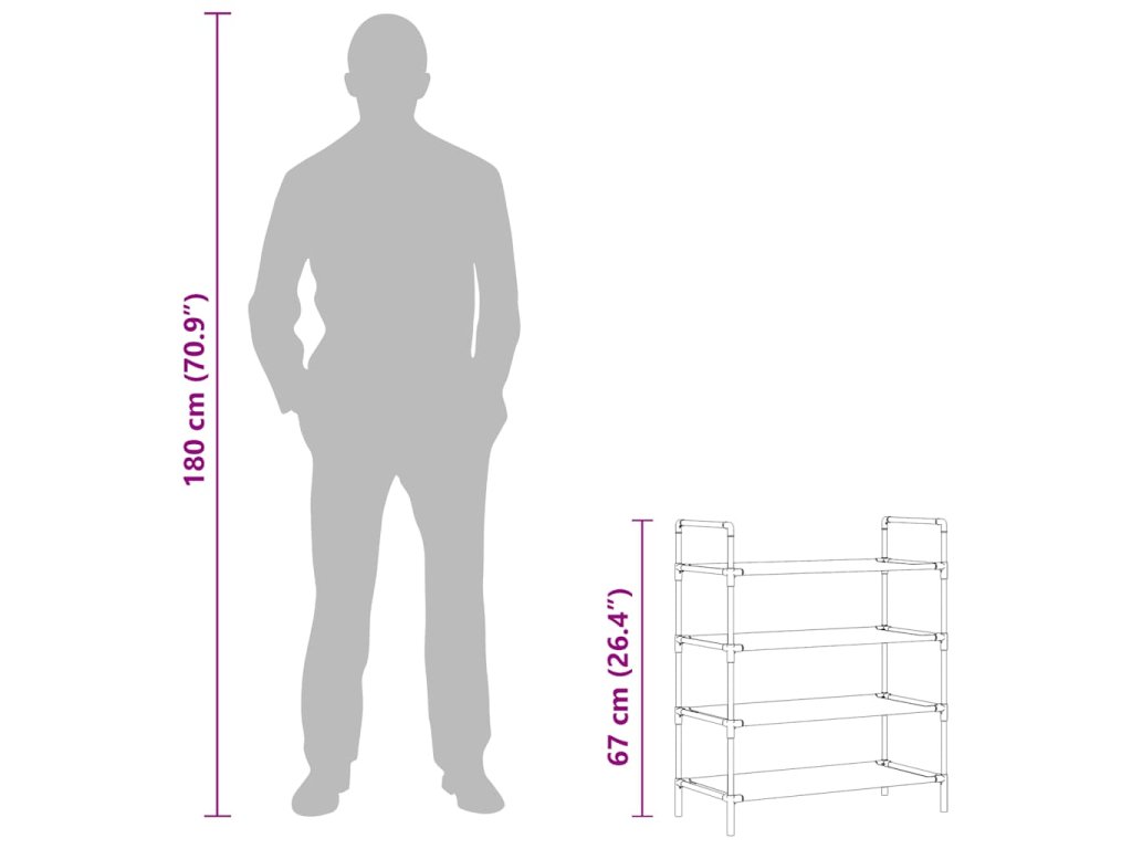 Má trubkový kovový rám, který je lehký, ale přitom robustní, lze jej tedy snadno přemisťovat a zároveň je i velmi stabilní. Má čtyři prostorné police, vyrobené z netkané textilie, které vám poskytnou spoustu prostoru pro přehledné ukládání vašich bot tak, aby vám nepřekážely.