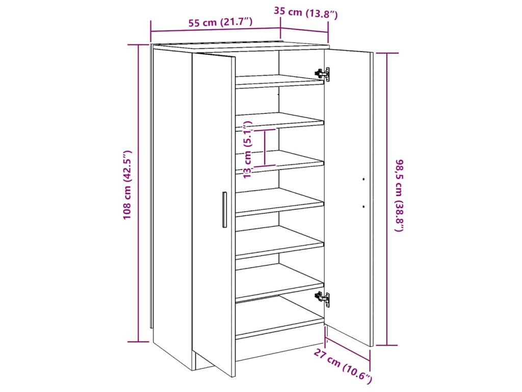 Tento botník má 7 přihrádek za dvoukřídlými dvířky, z nichž každá pojme 2 páry obuvi, takže do botníku se vejde celkem 14 párů. Tato pevná a odolná skříňka do předsíně je vyrobena z vysoce kvalitních materiálů, takže je velmi praktickým místem pro úhledné a stylové ukládání vaší obuvi.