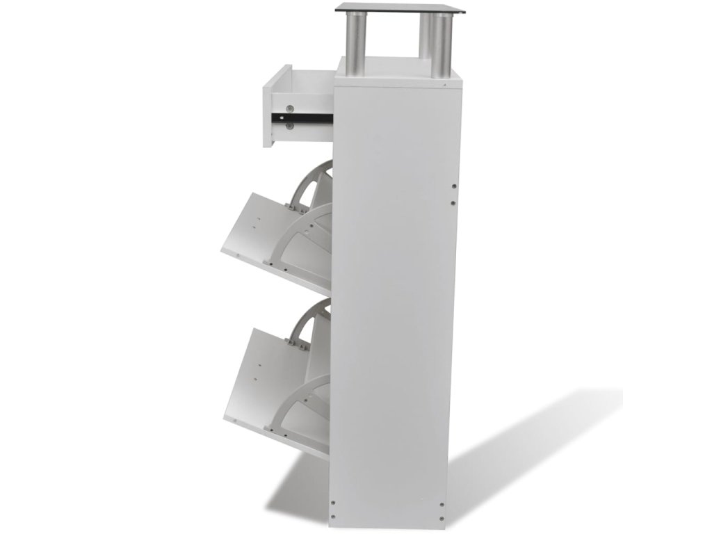 Každá z velkých přihrádek má střední dělicí příčku, abyste měli boty uspořádané. Můžete do nich uložit až 12 párů bot, a ochránit je tak před prachem. Šuplík v horní části můžete používat na doplňky jako jsou tkaničky, vložky do bot a další drobnosti. Horní skleněná polička se hodí k vystavování drobných předmětů.