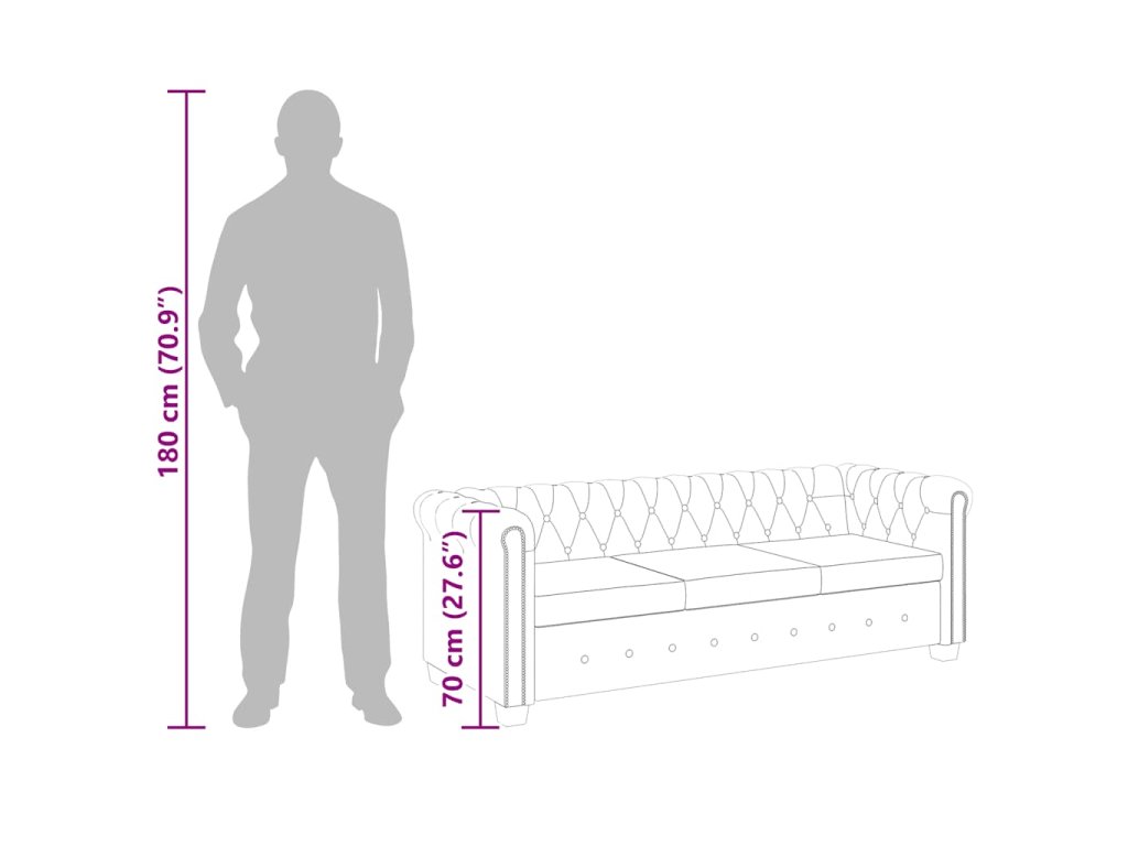 Tato sedačka Chesterfield je perfektní kombinací pohodlí a sofistikovanosti a bude skvělým doplňkem do každého domova či kanceláře. Tato 3místná pohovka s ozdobným prošíváním a cvočky a půvabně zakřivenými područkami dodá každému interiéru nádech luxusu a stylu.