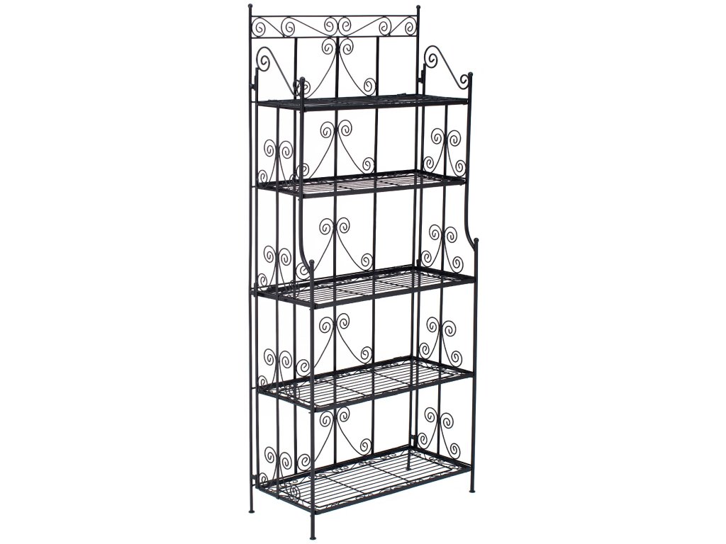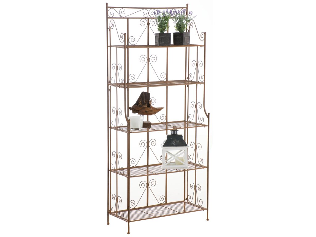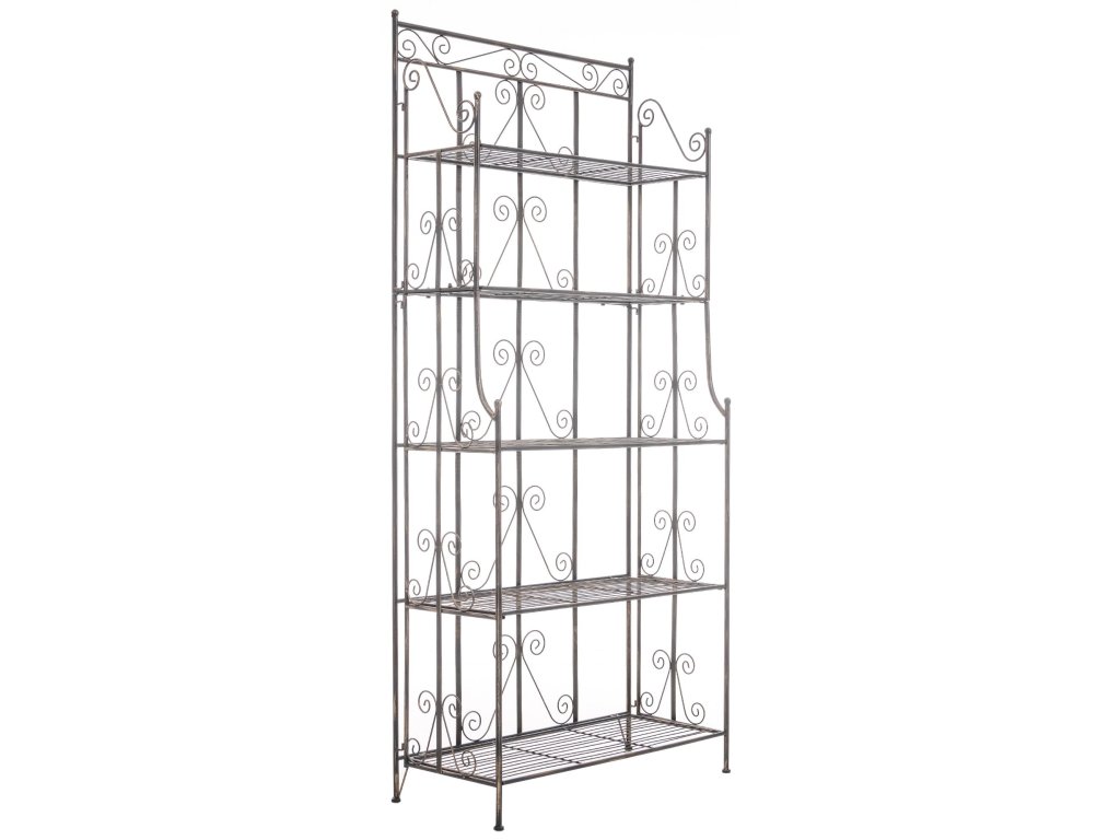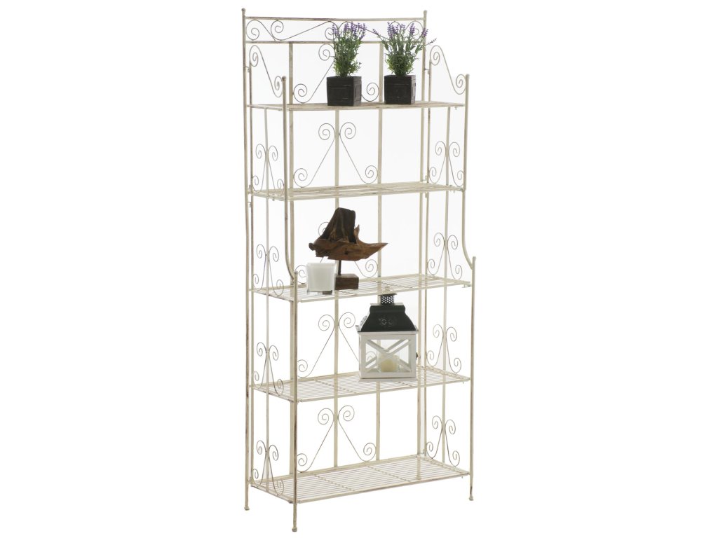 CiaraStojící police Ciara je univerzální a dekorativní police ve venkovském stylu, která je vhodná pro vnitřní i venkovní použití. Díky pěti sklopným policím nabízí dostatek prostoru pro rostliny, knihy a další dekorativní předměty. Práškově lakovaná kovová konstrukce zajišťuje robustnost a stabilitu, takže je ideální pro použití na balkoně, v zahradě, na terase i v obývacích pokojích a dalších obytných prostorech. Prostorově úsporný design umožňuje kompaktní skladování, když se police nepoužívá. Filigránské ozdoby dodávají polici atraktivní vzhled, který harmonicky zapadne do každého stylu bydlení. Stojící policový regál Ciara se snadno a rychle sestavuje a díky funkci skládání polic nabízí další flexibilitu.