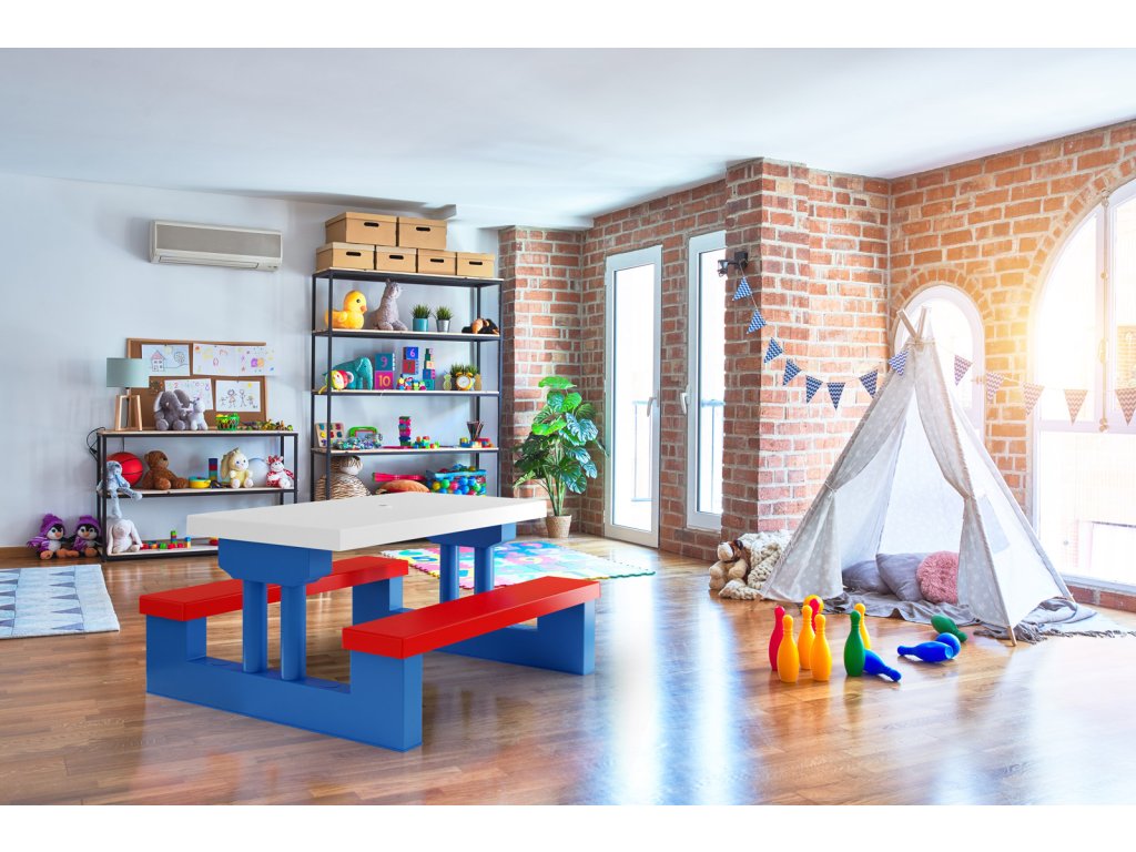 Konstrukce je navržena s ohledem na bezpečnost – všechny hrany jsou zaoblené a konstrukce je stabilní díky široké ploše základny. Povrchy jsou snadno omyvatelné a odolné, takže se skvěle hodí i pro použití uvnitř – například v dětském pokoji.