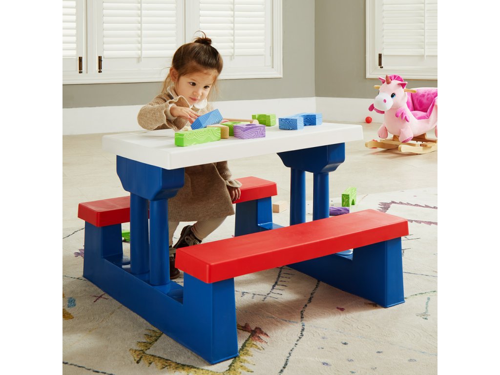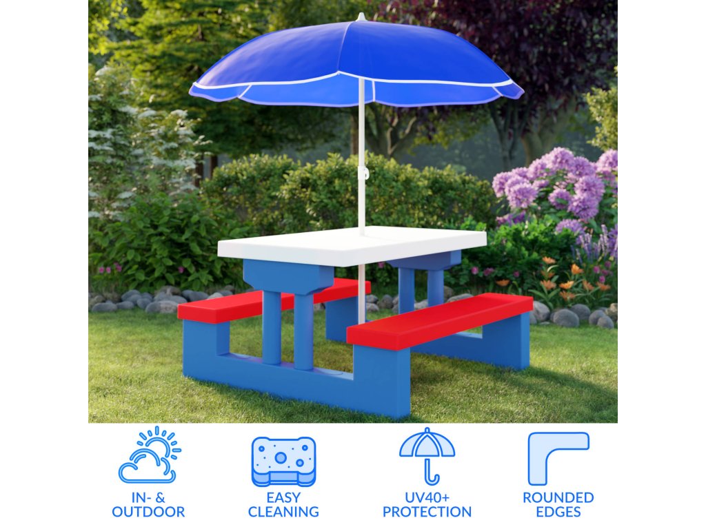 Vytvořte svým dětem ideální místo ke hraní a odpočinku s touto barevnou dětskou sedací soupravou se slunečníkem. Skládá se z pevně spojeného stolku a dvou laviček, které nabídnou pohodlné posezení až pro čtyři děti. Velký slunečník z polyesteru poskytuje dostatečnou ochranu před sluncem, ať už si děti hrají na zahradě, terase nebo na dvoře.