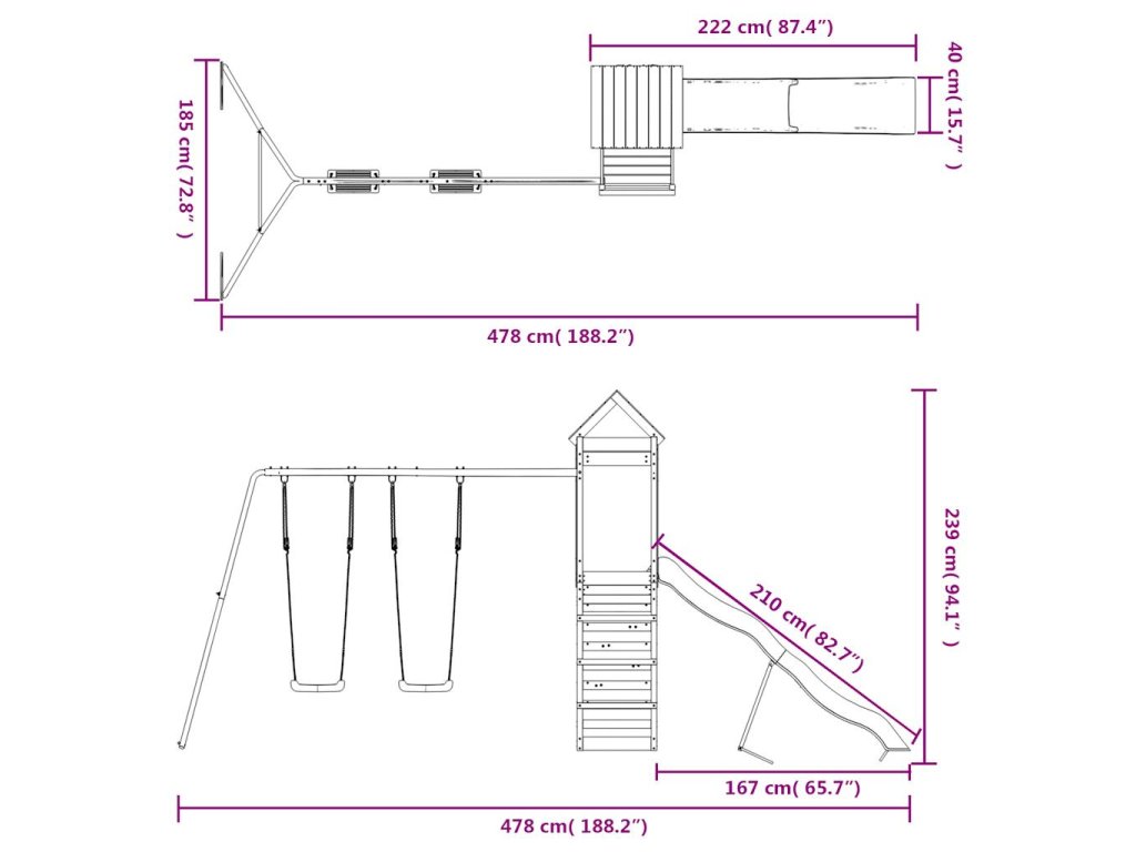 - Multifunkční herní centrum: Dětské hřiště je vybavené plošinou ve výšce 118 cm a vyniká lezeckou stěnou, zvlněnou skluzavkou, dvěma houpačkami a pískovištěm. A navíc si mohou pozvat kamarády a užívat si zábavu společně.