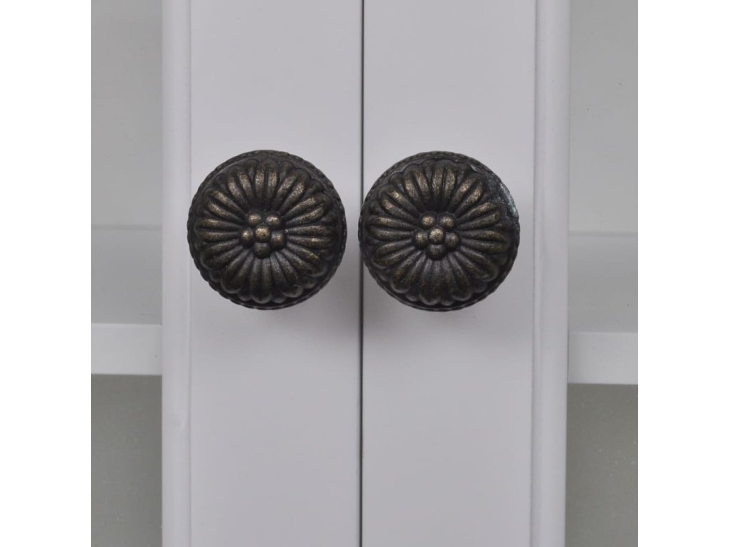 Skříňka má dvě zásuvky a dvě police, které vám umožní snadno ukládat cereálie, koření, občerstvení, konzervy a mnoho dalšího. Je opatřena dvojitými prosklenými dvířky a její 2 zásuvky se snadno otevírají, takže můžete rychle vyjmout to, co potřebujete. Háčky a tyč se používají pro zavěšení hrnků nebo utěrek.