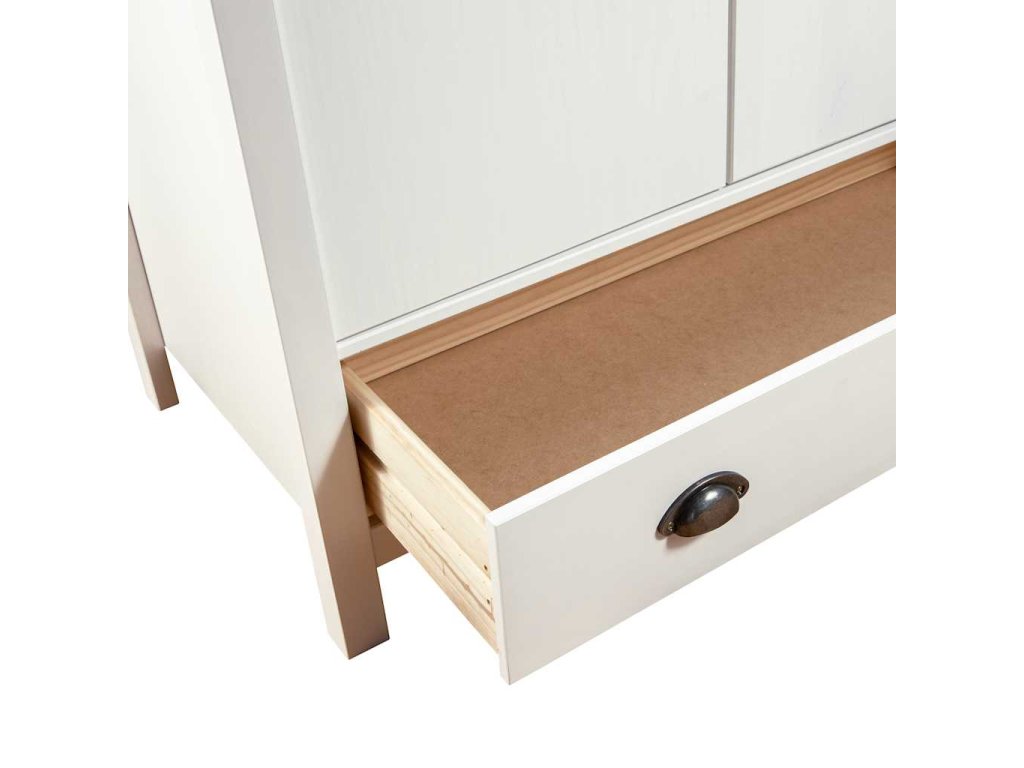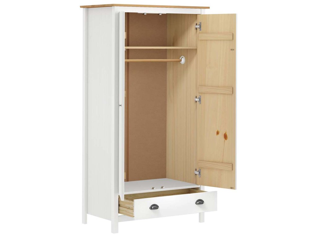 Šatní skříň je zhotovena z masivního borového dřeva, je tedy velmi robustní. Šatní skříň s 1 zásuvkou a 1 policí poskytuje dostatek prostoru pro přehledné uložení menších věcí na dosah ruky. Velká přihrádka je vybavena šatní tyčí, kterou můžete použít k zavěšení kabátů, šatů atd. Šatní skříň se snadno sestavuje.