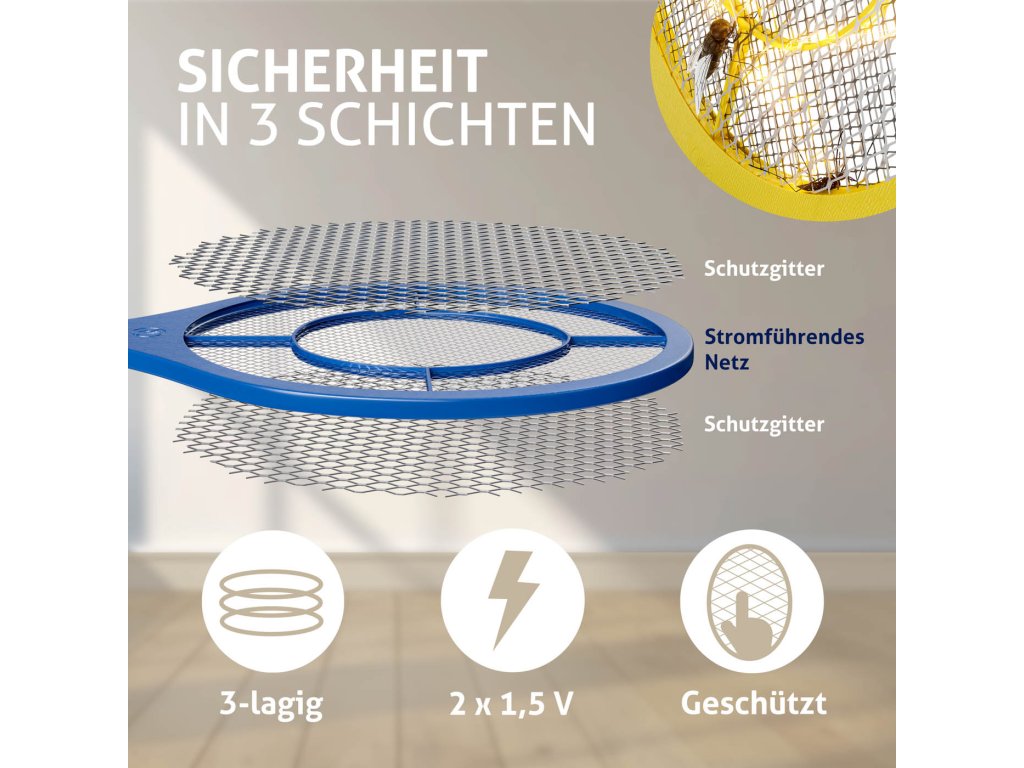 Plácačka je vybavena dvojitým bezpečnostním ochranným pletivem, které chrání uživatele i domácí mazlíčky. Mezi ochrannými vrstvami se nachází elektricky nabité jemné drátěné pletivo, které efektivně likviduje hmyz při kontaktu.