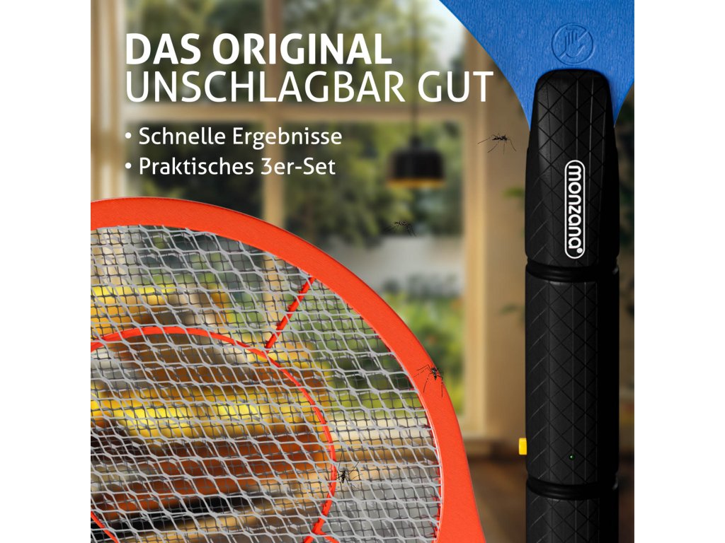 Zbavte se otravných much, komárů a jiného hmyzu jedním stiskem tlačítka! Elektrická plácačka od MONZANA® v praktické sadě 3 kusů (červená, modrá a žlutá) umožňuje rychlé, bezpečné a efektivní odstranění hmyzu bez chemikálií.