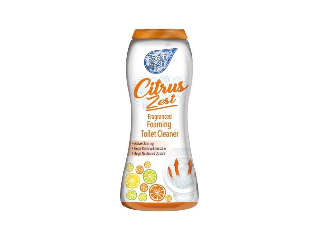 Fresh Foam - pěnící a čistící prášek do WC s vůní Citrus Zest - 370g přípravek pro rychlou neutralizaci zápachu na toaletě v podobě prášku, který jednoduše aplikujte do toaletní mísy. Tento prášek při styku s vodou začne pěnit a uvolňovat do prostoru příjemnou neutralizační vůni. Následně stačí jen použít WC kartáč a buď spláchnout nebo nechat prášek i nadále působit s cílem odstranění nečistot, vodního a močového kamene. Před aplikací je nutné nádobku s přípravkem promnout, prášek bývá často slepen a před prvním použitím je nutné zmáčknout dno balení a následně protřepat