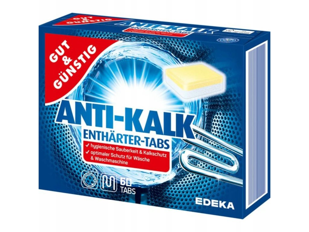 G&G odvápňovač do praček Anti-Kalk - 60 TABLET. Dokonalý odvápňovač v prášku s formulí chránící barvy tkanin. Produkt účinně změkčuje vodu a brání usazování se kamene ve tvé pračce. Díky zdokonalené receptuře, aktivní granulky prášku fungují již při teplotě 30 stupňů. Pravidelné používání odvápňovače G&G zmenšuje spotřebu pracího prášku a umožňuje více efektivní praní.
