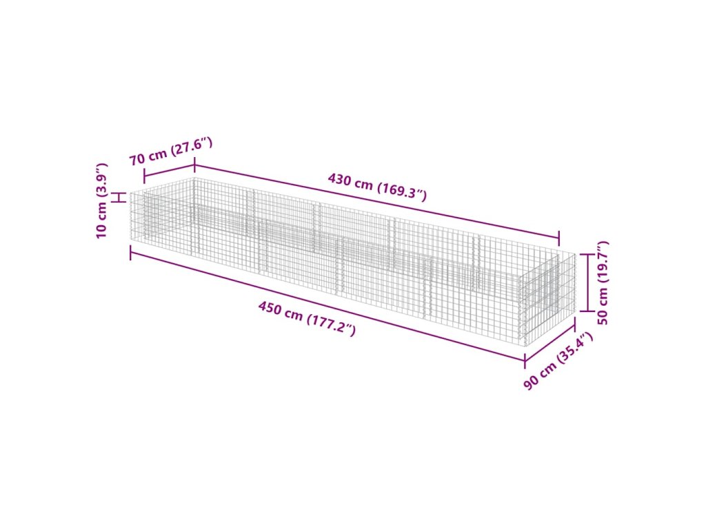 Robustní gabion je určen k tomu, aby byl naplněn kameny nebo štěrkem. Je vyrobený z nerezavějící pozinkované oceli, která nepodléhá povětrnostním vlivům, takže vysoký záhon je velmi stabilní a odolný. Síťová mřížka je tvořená svislými a vodorovnými dráty, které jsou ve všech spojích svařené, aby se tak zajistila mimořádná pevnost.