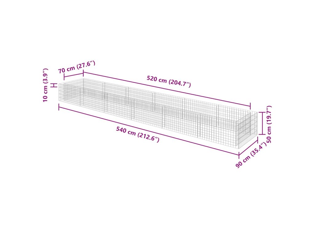 Robustní gabion je určen k tomu, aby byl naplněn kameny nebo štěrkem. Je vyrobený z nerezavějící pozinkované oceli, která nepodléhá povětrnostním vlivům, takže vysoký záhon je velmi stabilní a odolný. Síťová mřížka je tvořená svislými a vodorovnými dráty, které jsou ve všech spojích svařené, aby se tak zajistila mimořádná pevnost.