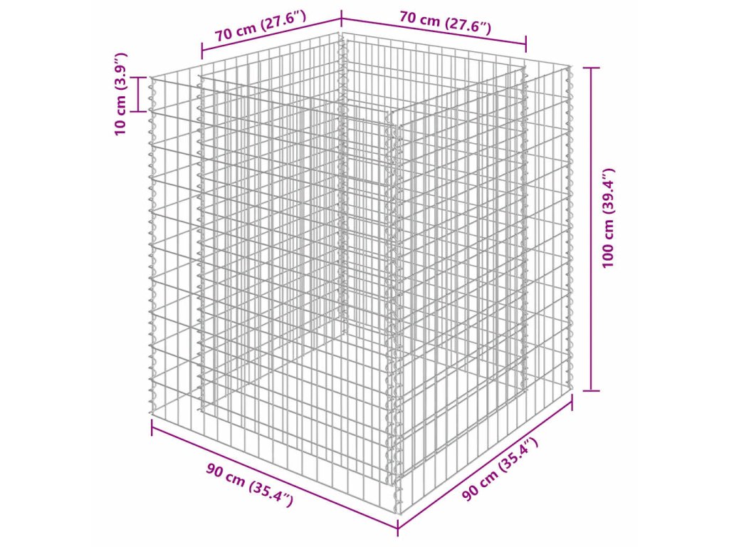 Robustní gabion je určen k tomu, aby byl naplněn kameny nebo štěrkem. Je vyrobený z nerezavějící pozinkované oceli, která nepodléhá povětrnostním vlivům, takže vysoký záhon je velmi stabilní a odolný. Síťová mřížka je tvořená svislými a vodorovnými dráty, které jsou ve všech spojích svařené, aby se tak zajistila mimořádná pevnost.
