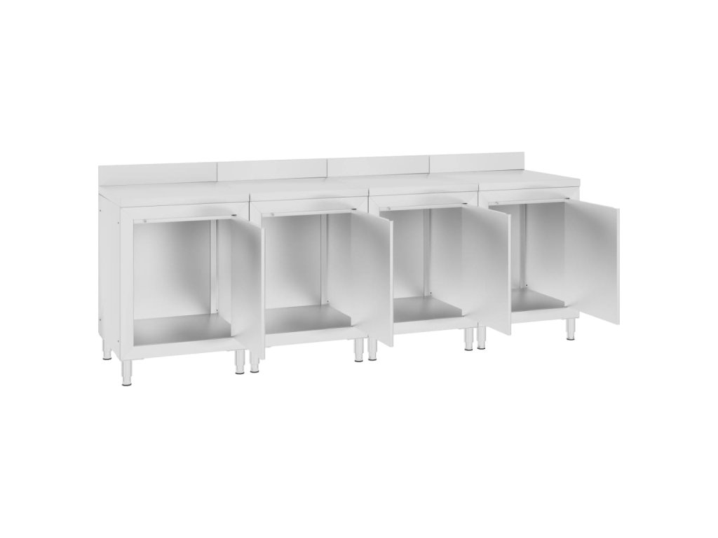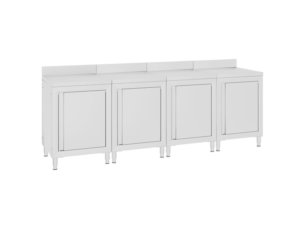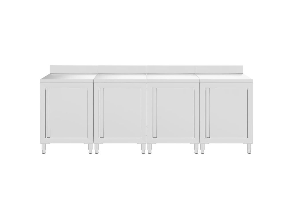 Set gastro skříněk je vyrobený z kvalitní nerezové oceli a je robustní, antikorozní a snadno se čistí. Spodní skříňka poskytuje dostatek úložného prostoru pro úklidové vybavení a příslušenství. Nastavitelné nožičky umožňují vyrovnat skříňku i na vodorovné ploše. Součástí skříňky je 10 cm vysoký zadní lem.
