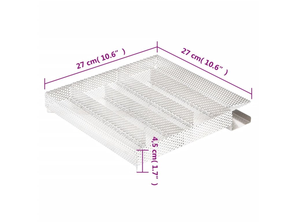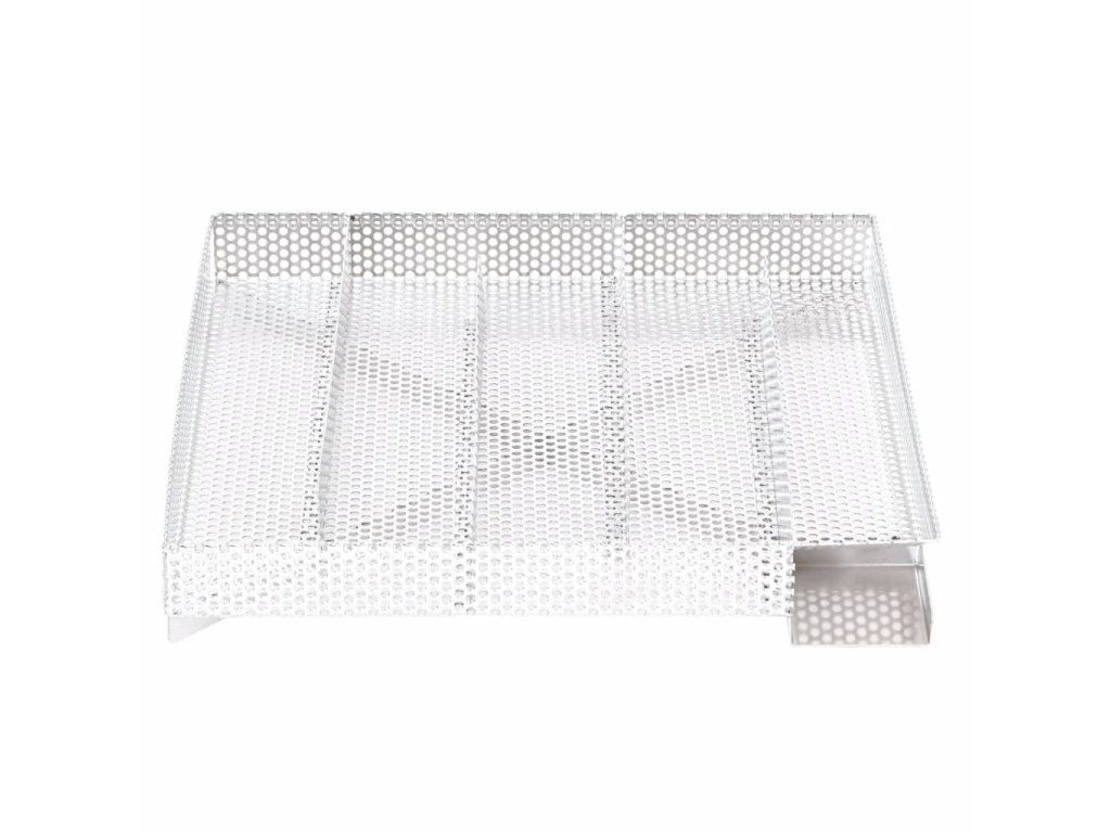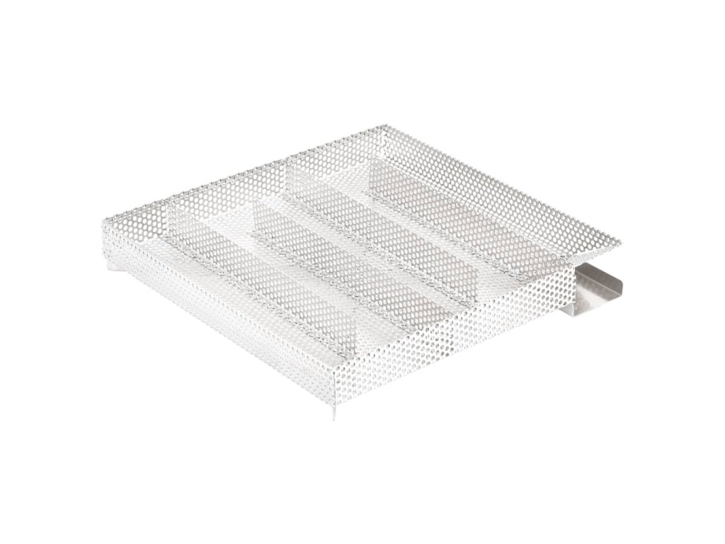 - Pevná mřížková konstrukce: Kompaktní mřížka čtvercového tvaru umožňuje rovnoměrné a pomalé hoření třísek až po dobu 16 hodin. Délka trvání závisí především na druhu dřeva určeného k uzení. Pro dosažení nejlepších výsledků se doporučuje používat štěpky o velikosti zrn 0,5–2,0 mm.