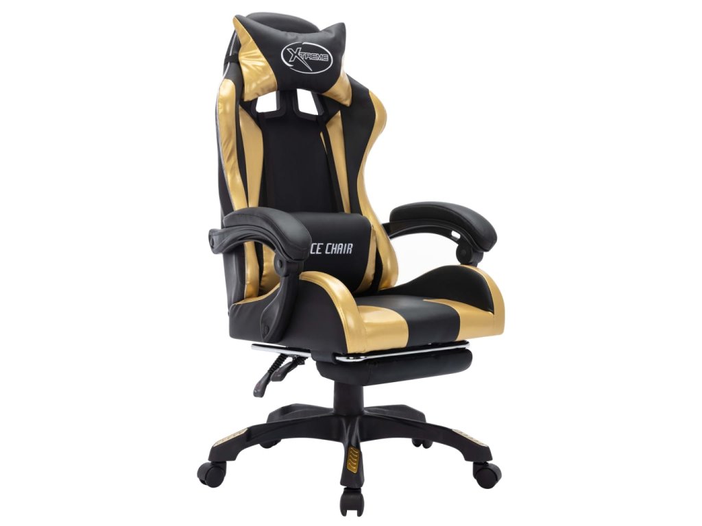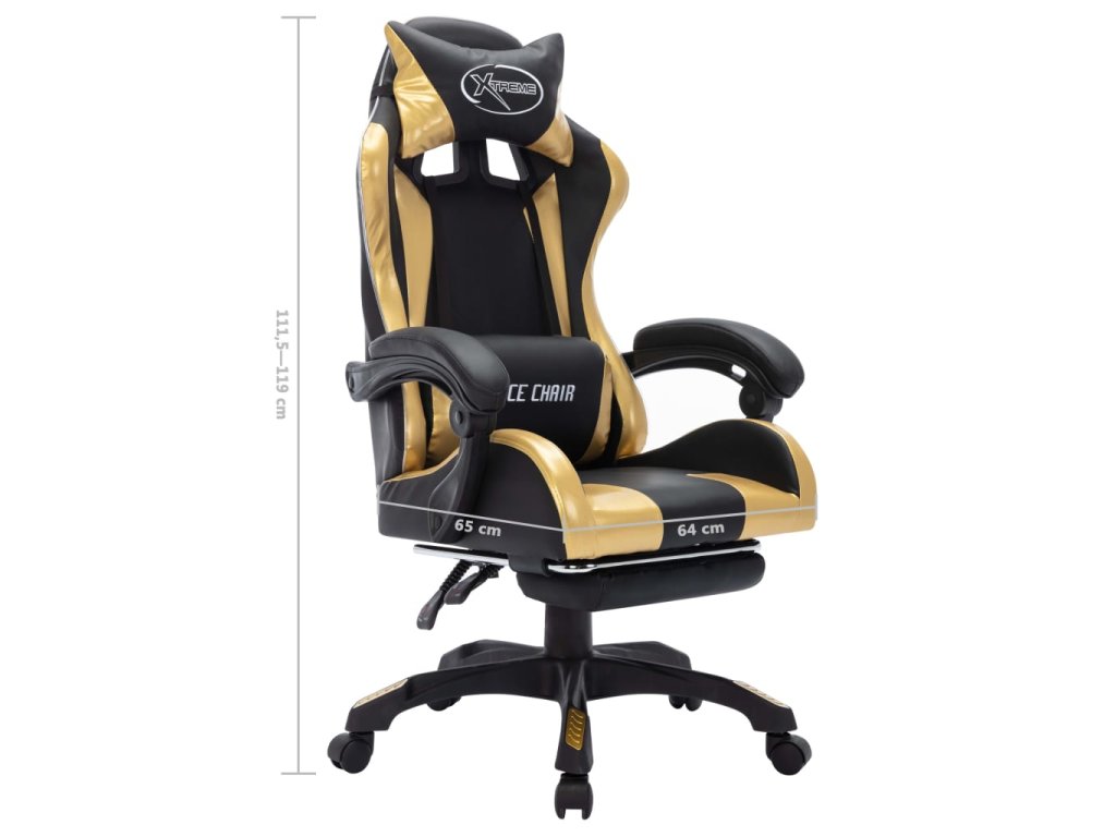 Tato herní židle je čalouněná umělou kůží, která se snadno čistí. Má sklopnou opěrku nohou, kterou lze sklopit pod sedák, kdykoli ji nepoužíváte. Součástí židle je také hustě polstrovaná opěrka hlavy a polštářek pod bedra, která vám nabídnou extra pohodlí pro každý náročný pracovní den. Kancelářská židle je vybavená plynovým zvedacím mechanismem, takže je výškově nastavitelná. Úhel sklopení je také nastavitelný, takže pokud máte pocit, že byste si chtěli zdřímnout, umístěte opěradlo do zcela sklopené polohy. Podvozek s pojezdovými kolečky s 360° otáčením usnadňuje pohyb po okolí. Okraj opěradel je vybaven LED světly poskytující lepší herní atmosféru. Pomocí dálkového ovladače můžete snadno měnit barvu a způsob blikání světel.