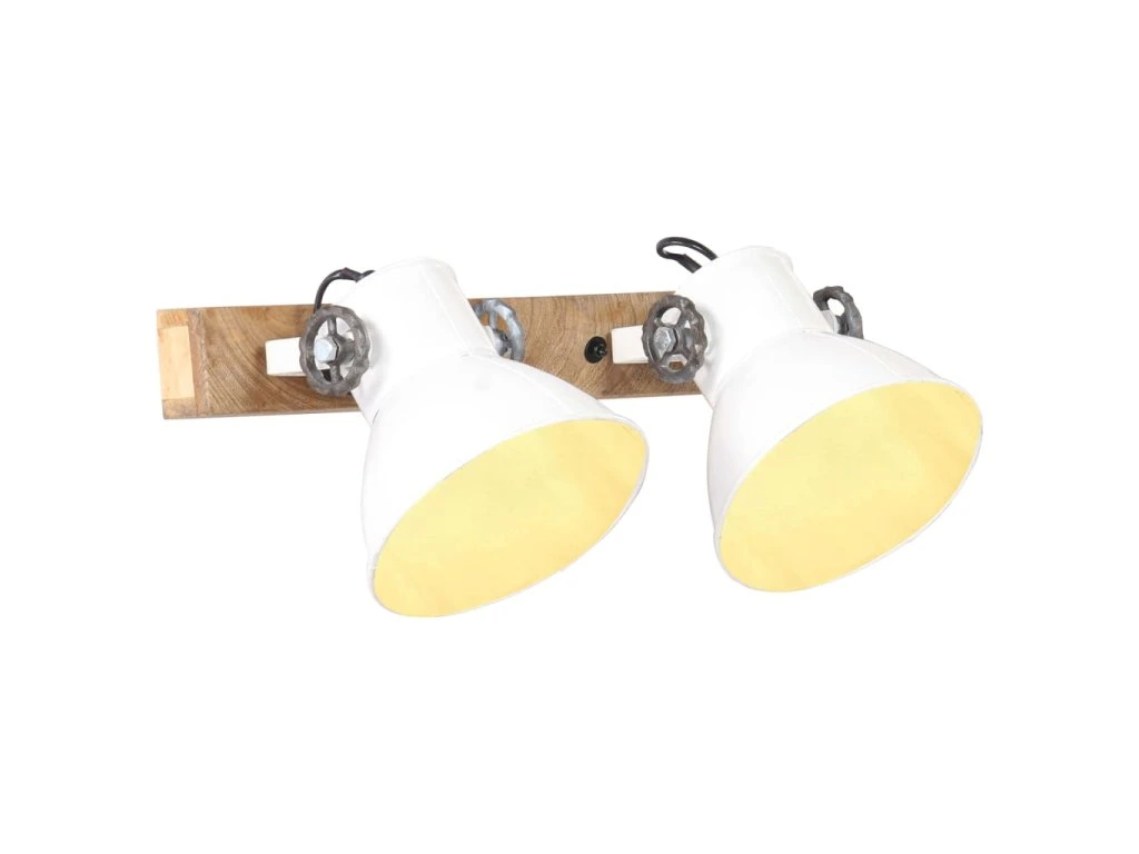 Železná stínidla s bílým povrchem doplňuje starovenkovský hnědý odstín masivního mangovníkového dřeva, takže skvěle zapadnou do každého venkovského či industriálního interiéru. Stropní světlo má 2 stínidla, do kterých je třeba namontovat žárovky s paticí E27 o maximálním výkonu 25 wattů. K instalaci si můžete vybírat ze žárovek E27 různých barev, abyste si doma navodili ideální atmosféru klidu a pohody. Tuto lampu lze rovněž připevnit ke stropu.