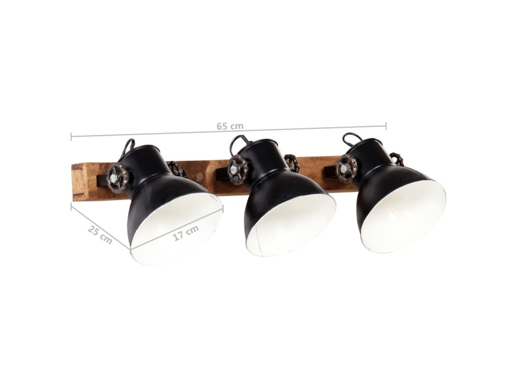 Železná stínidla s černým povrchem doplňuje starovenkovský hnědý odstín masivního mangovníkového dřeva, takže skvěle zapadnou do každého venkovského či industriálního interiéru. Stropní světlo má 3 stínidla, do kterých je třeba namontovat žárovky s paticí E27 o maximálním výkonu 25 wattů. K instalaci si můžete vybírat ze žárovek E27 různých barev, abyste si doma navodili ideální atmosféru klidu a pohody. Tuto lampu lze rovněž připevnit ke stropu.