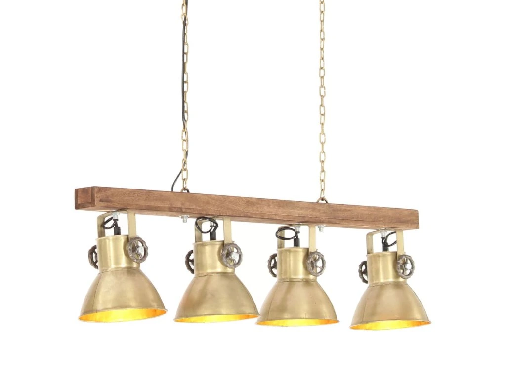 Železná stínidla s mosazným povrchem doplňuje starovenkovský hnědý odstín masivního mangovníkového dřeva, takže skvěle zapadnou do každého venkovského či industriálního interiéru. Stropní světlo má 4 stínidla, do kterých je třeba namontovat žárovky s paticí E27 o maximálním výkonu 25 wattů. K instalaci si můžete vybírat ze žárovek E27 různých barev, abyste si doma navodili ideální atmosféru klidu a pohody.