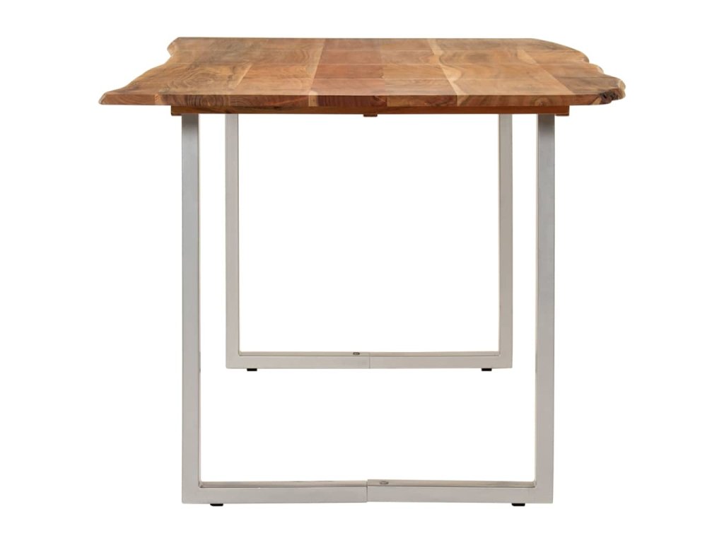 Tento jídelní stůl je vyrobený z masivní akácie, tropického tvrdého dřeva, které je oceňované pro svou pevnost a bohatou kresbu. Živý tvar a okraje stolní desky jsou záměrně opracované tak, aby do vašeho interiéru přinesly původní charakter a přirozený dojem stromu. Každý krok procesu se provádí s největší péčí, ať už jde o leštění, natírání nebo lakování. Ocelové nohy doplňují industriální vzhled a přispívají k robustní konstrukci.