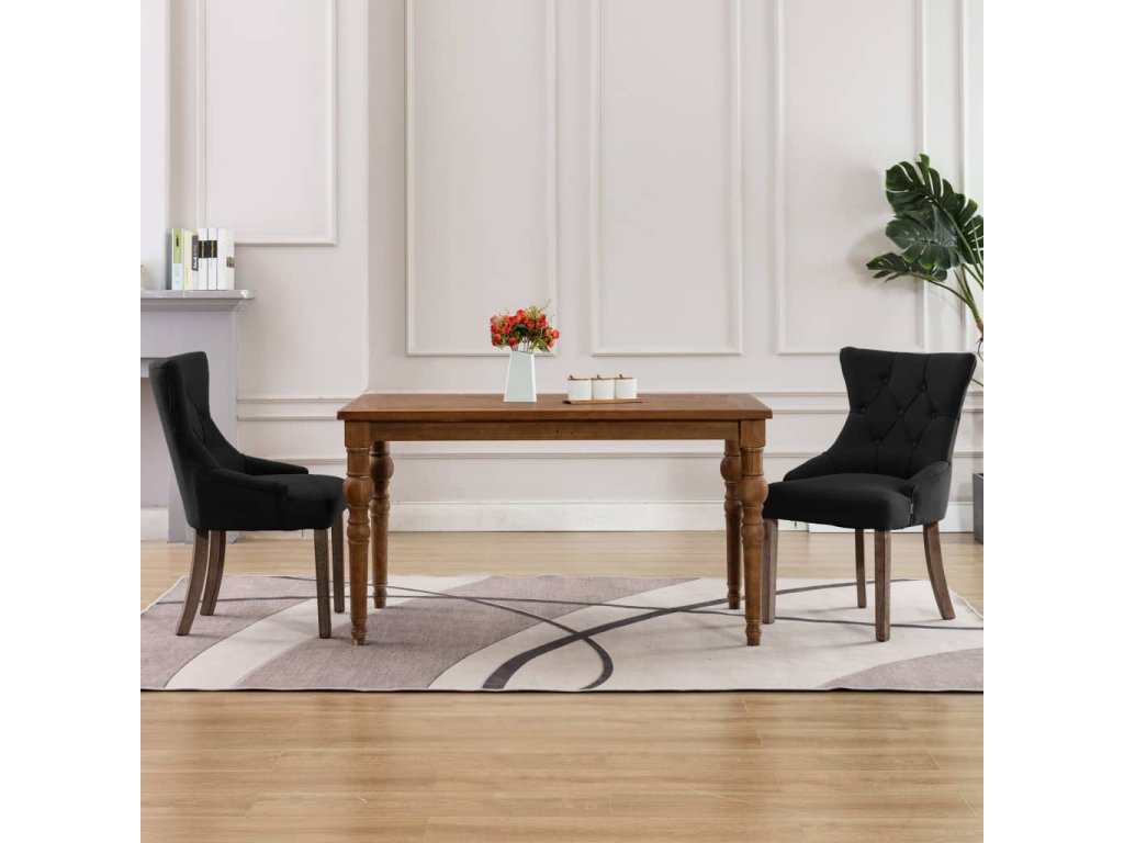 Design s krásnými knoflíky na opěradle těchto jídelních židlí je velmi atraktivní. Kuchyňské židle jsou čalouněné sametem, takže jsou měkké a příjemně se na nich sedí. Jejich silně polstrované sedáky a zaoblená opěradla vám zajistí optimální pohodlí. Nohy z kaučukovníkového dřeva zase přispívají k lepší stabilitě a zaručují židlím výtečnou odolnost.