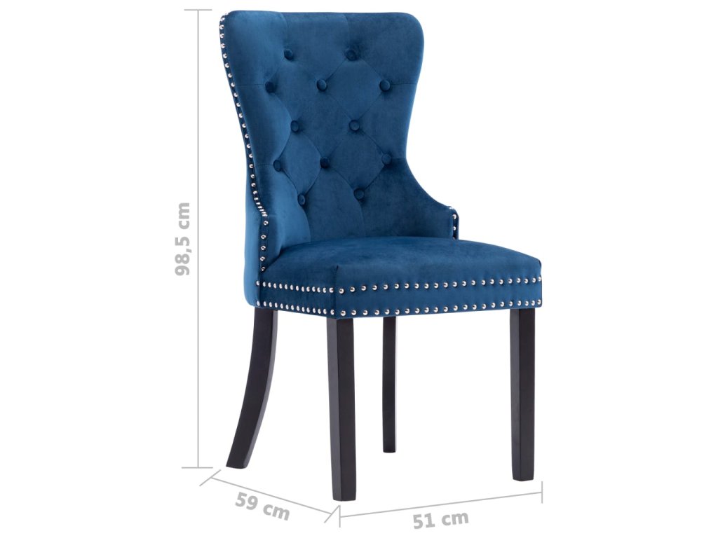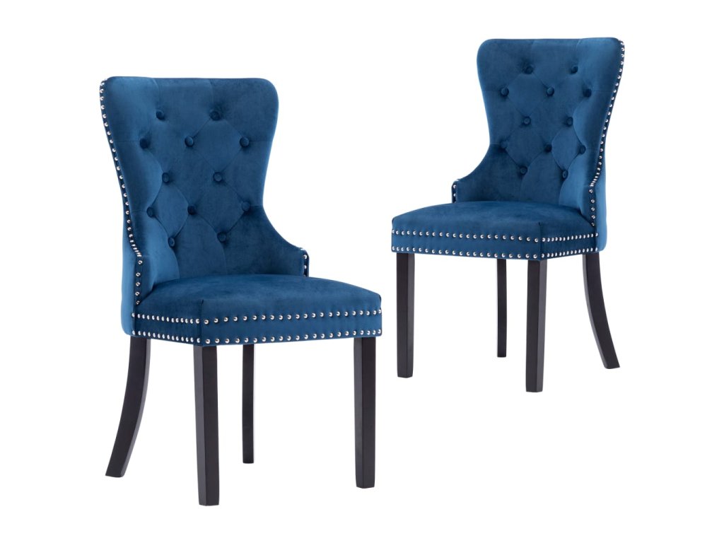 Jídelní židle jsou čalouněné na dotek hebkou sametovou látkou, takže se vám na nich bude moc dobře sedět při stolování, čtení i jen tak u odpočinku. Jejich klasickou krásu zdůrazňují dekorativní knoflíky na opěradle a kovové cvočky podél okrajů. Sedák podepírají nohy z masivního kaučukovníku, židle jsou tedy také stabilní a odolné.