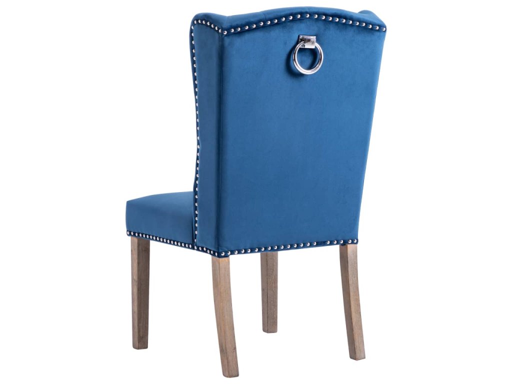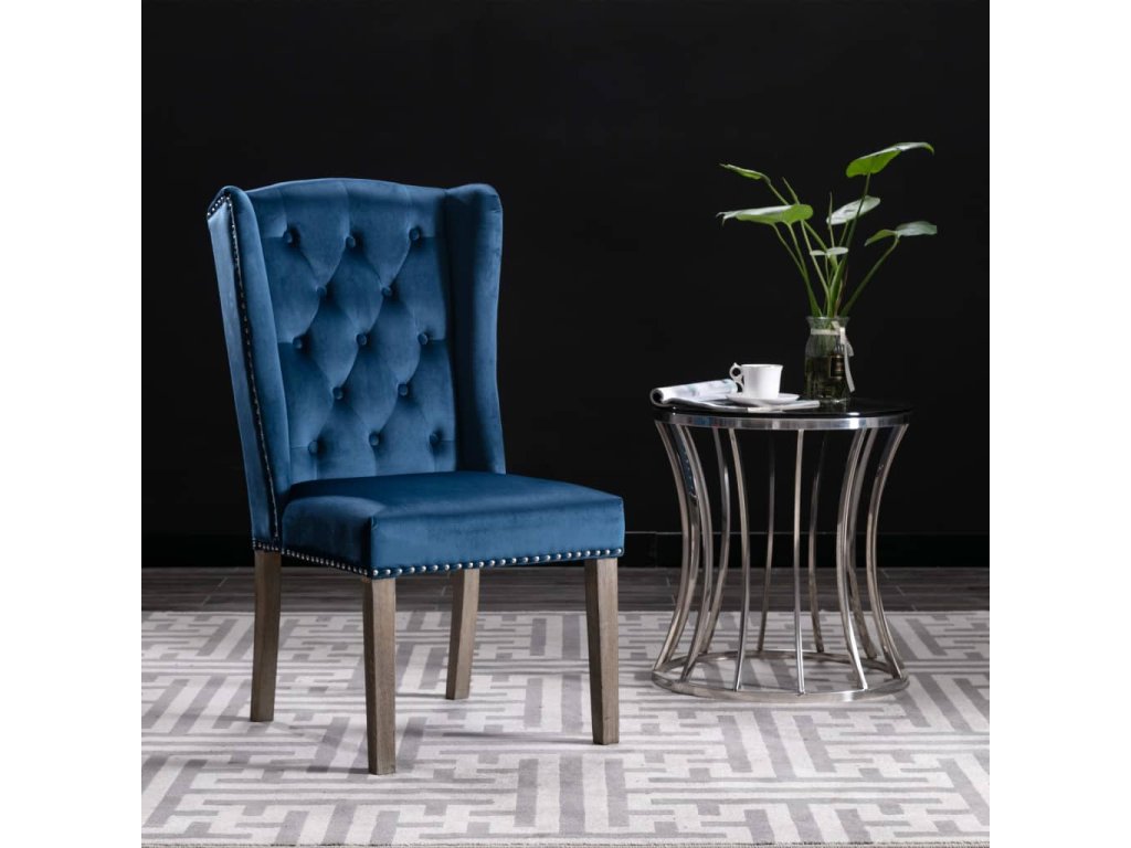 Jídelní židle jsou čalouněné na dotek hebkou sametovou látkou, takže se vám na nich bude moc dobře sedět při stolování, čtení i jen tak u odpočinku. Jejich klasickou krásu zdůrazňují dekorativní knoflíky na opěradle a kovové cvočky podél okrajů. Sedák podepírají nohy z masivního kaučukovníku, židle jsou tedy také stabilní a odolné.