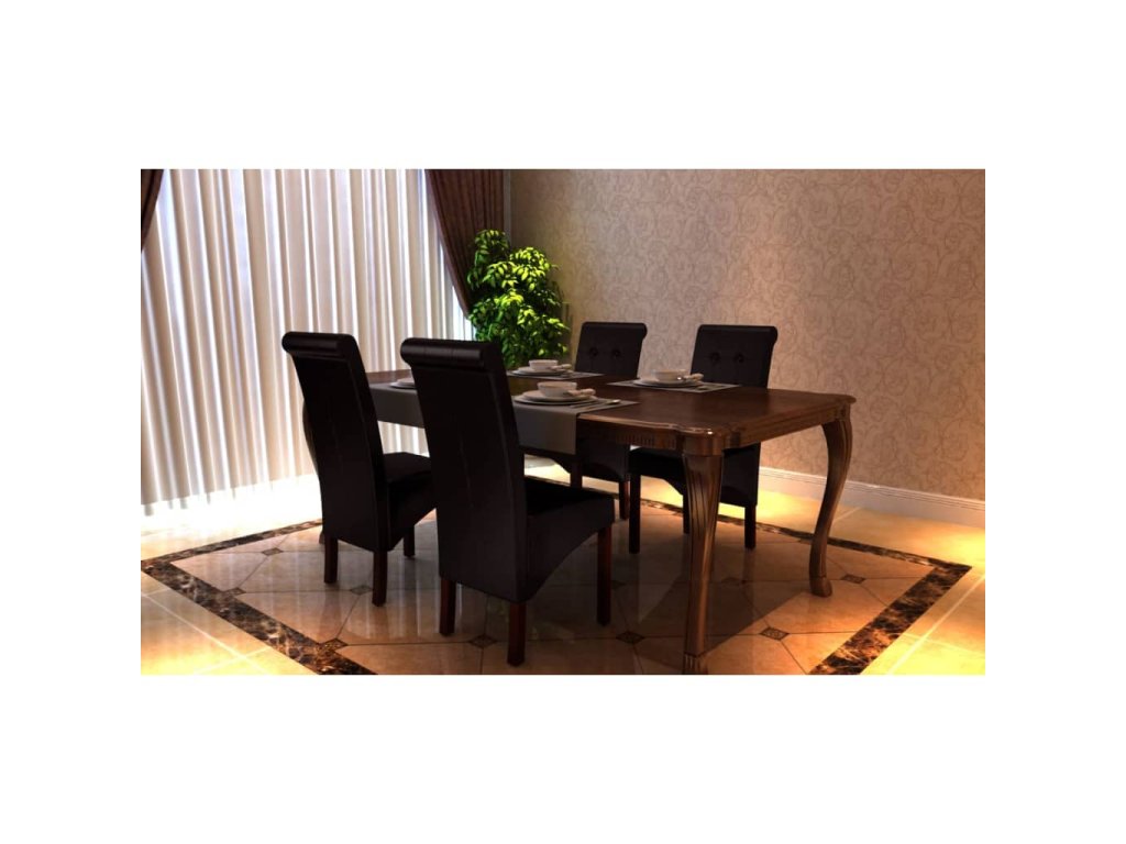 Tento set 4 pohodlných a širokých jídelních židlí má rustikální design s ergonomicky tvarovanými sedadly a opěradly. Nohy jsou vyrobené z masivního dřeva s tmavě hnědou lazurou. Jejich rohy jsou pro větší bezpečnost zaoblené. Údržba a čištění jsou velmi snadné. Sedadla a opěradla těchto jídelních židlí jsou polstrovaná odolnou syntetickou kůží.