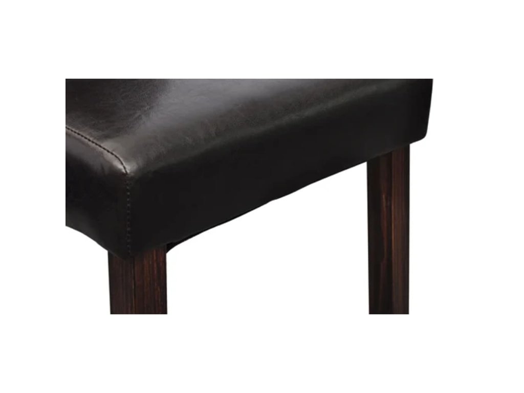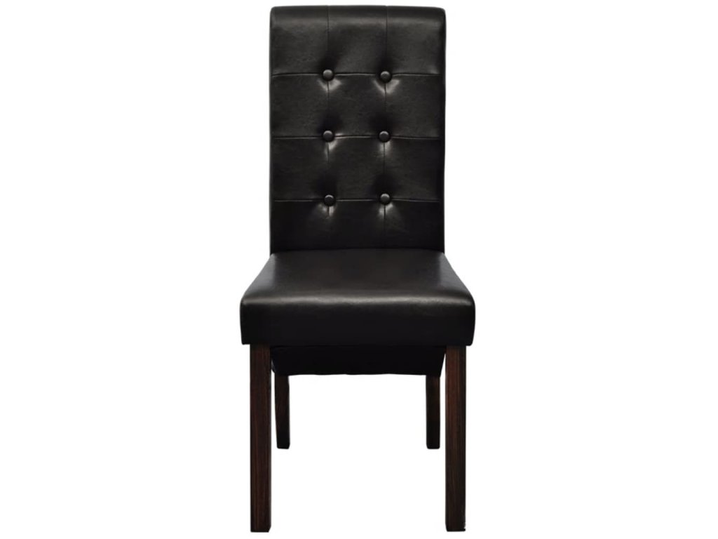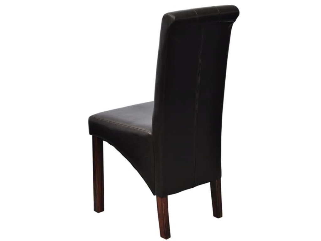 Tento set 6 pohodlných a širokých jídelních židlí má rustikální design s ergonomicky tvarovanými sedadly a opěradly. Nohy jsou vyrobené z masivního dřeva s tmavě hnědou lazurou. Jejich rohy jsou pro větší bezpečnost zaoblené. Údržba a čištění jsou velmi snadné. Sedadla a opěradla těchto jídelních židlí jsou polstrovaná odolnou syntetickou kůží.