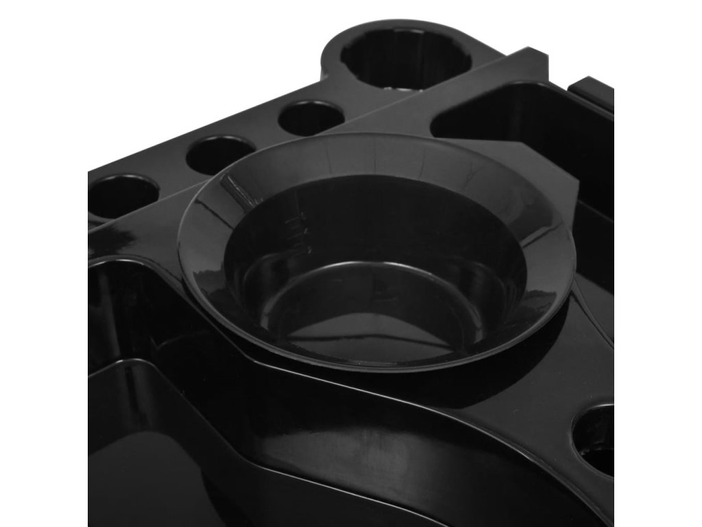 Horní panel má integrované držáky na fény a boční držáky pro rozprašovače. Jednotlivé zásuvky jsou vyrobeny z pevného tvrdého plastu a snadno se s nimi manipuluje. Čtyři kolečka zajišťují snadnou manipulaci s vozíkem, abyste ho měli vždy po ruce.
