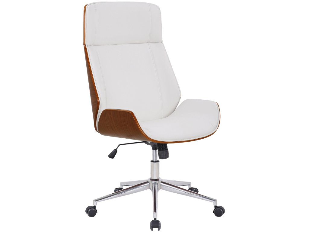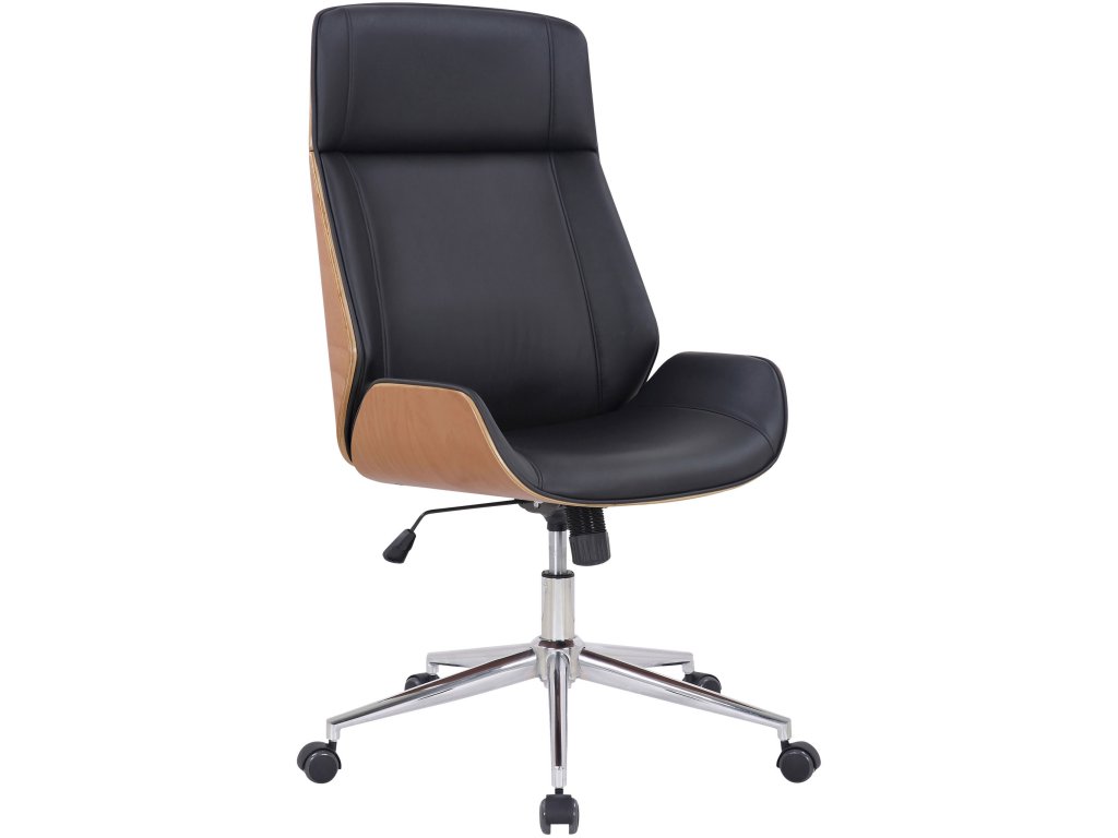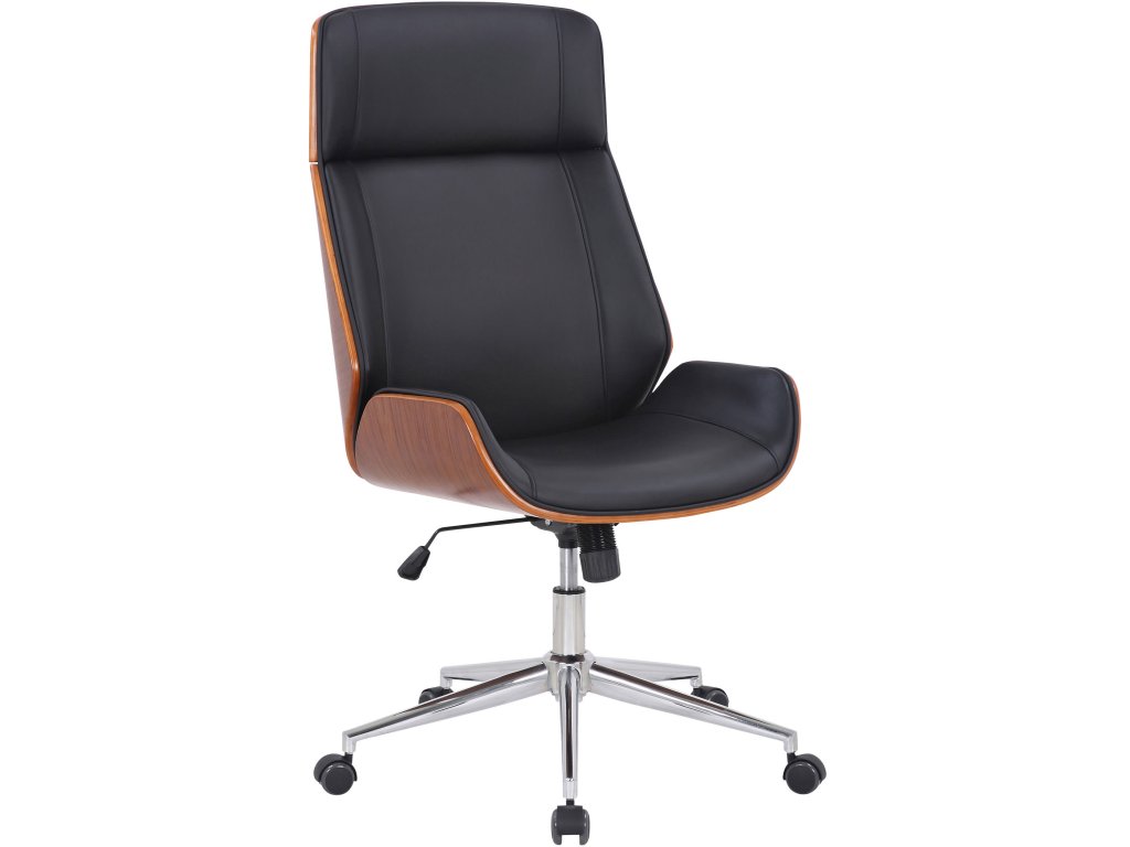 Kancelářská židle VarelTato kancelářská židle Varel zaujme nejen svým moderním vzhledem, ale nabízí také bezkonkurenční pohodlí. Otočná židle je pohodlně čalouněná a má potah z umělé kůže, díky čemuž se mimořádně snadno čistí. Plynulé nastavení výšky a houpací mechanismus umožňují pohodlné sezení i několik hodin v kuse. Stabilitu zaručuje kovový rám chromového vzhledu. Pět hladce se pohybujících koleček usnadňuje přejezd po podlaze - ať už na tvrdé, nebo kobercové podlaze. Elegantní chromovaný rám a kombinace umělé kůže a dřeva dodávají celku něco navíc a dotvářejí jeho design.