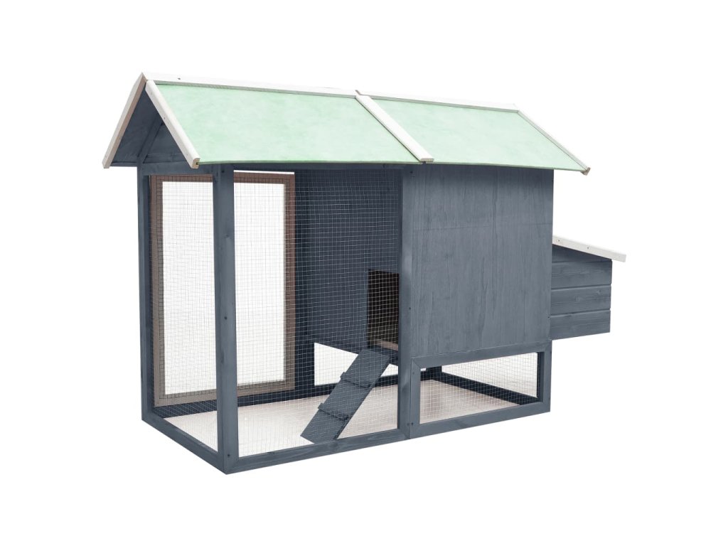 Pletivová konstrukce z železných drátů vám umožní kuřata neustále sledovat a zajistí v kleci volné proudění čerstvého vzduchu. Kurník tvoří vysoce kvalitní dřevěný rám, který vám bude sloužit po dlouhá léta. Zelená střecha chrání obyvatele před deštěm a v útulném domečku se krásně vyspí. Ze spodního do horního patra vede rampa, po níž mohou zvířata snadno vyšplhat nahoru. Výsuvné dno klece usnadňuje její čištění. Dvířka lze jednoduše zavřít a zajistit zasouvacími západkami.