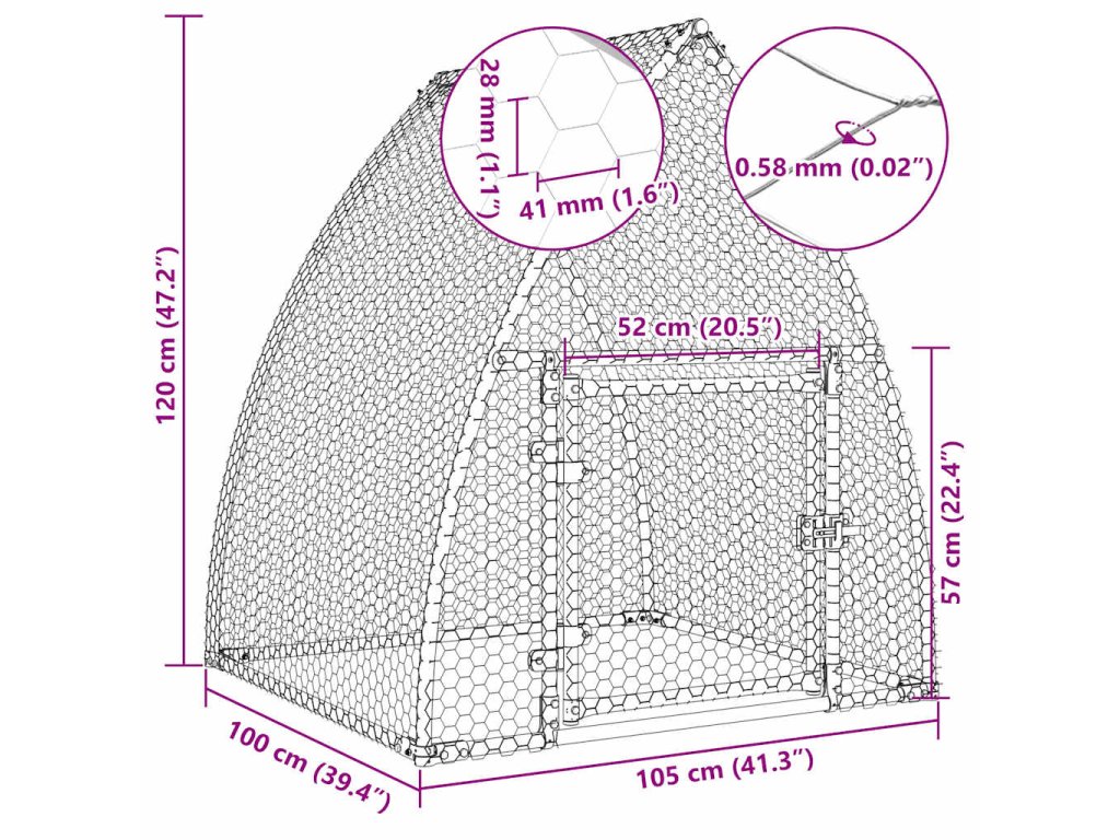 - Odolný a robustní rám: Klec je vyrobena z pozinkované oceli. Ocel je mimořádně tvrdý a pevný materiál. Zajišťuje pevnost a stabilitu. Pozinkování poskytuje lepší ochranu proti korozi a je užitečné pro výrobky, které se budou používat venku i v drsném prostředí.