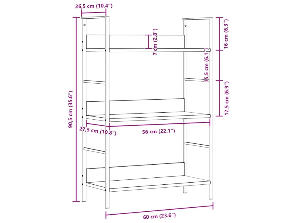 - Rozměry jedné vodorovné police: 56 x 27,6 x 1,5 cm (D x Š x V)