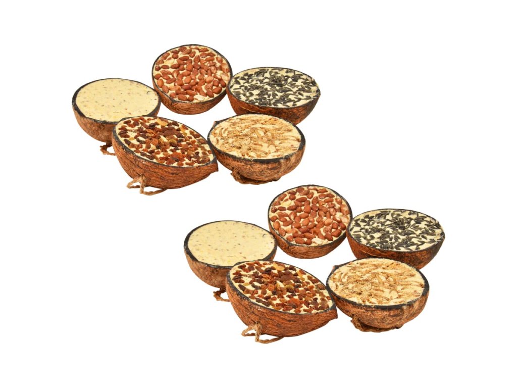 Těchto 10 půlek kokosového ořechu je naplněných směsí ptačího krmiva v 5 různých variantách. Volně žijící ptáčci v nich najdou prémiovou směs tuku a proteinů, která jim dodá potřebnou extra dávku energie.