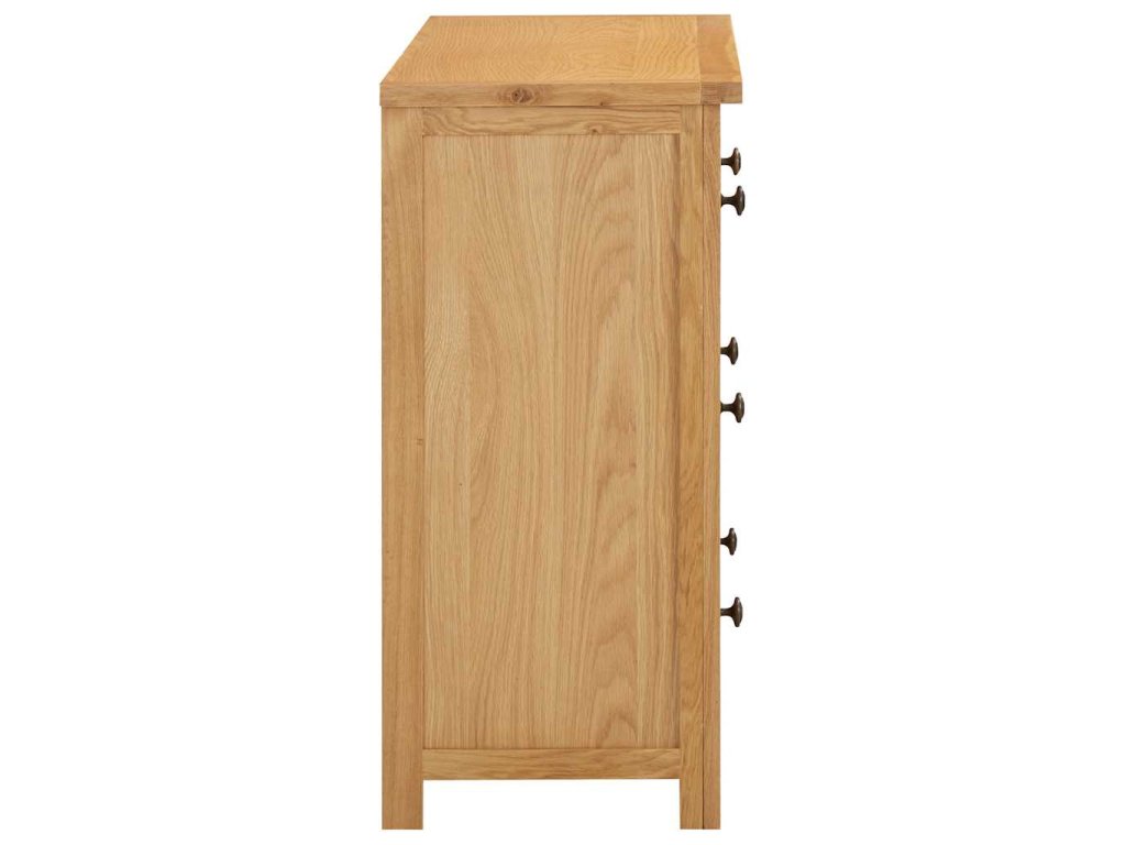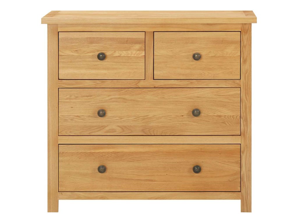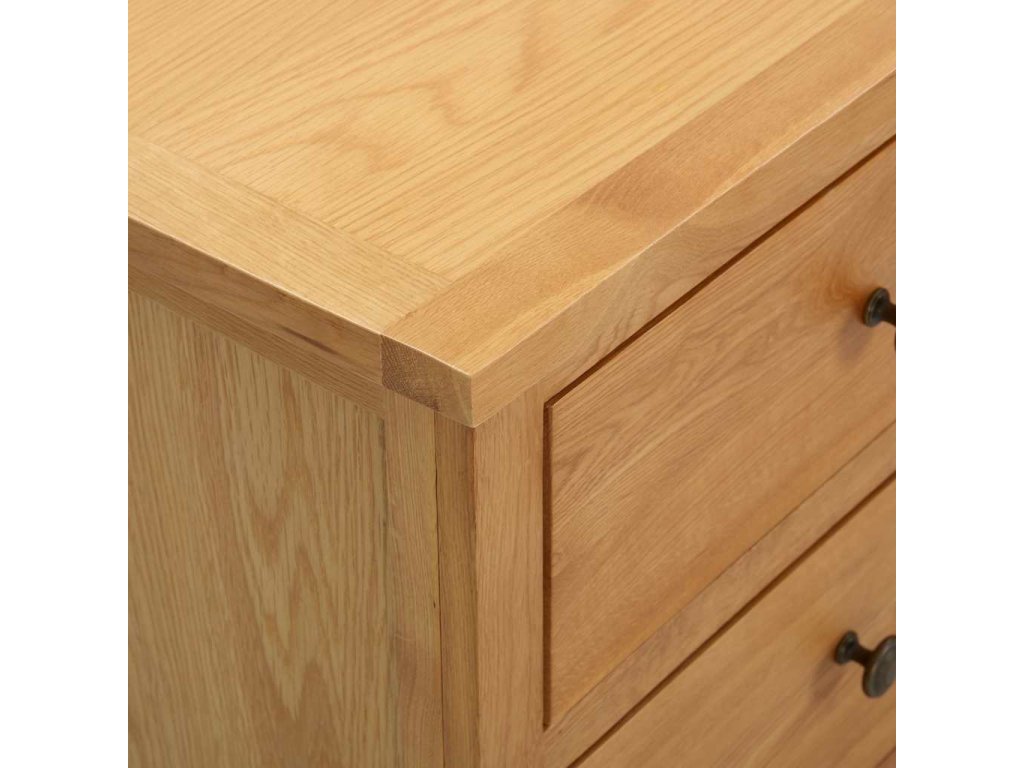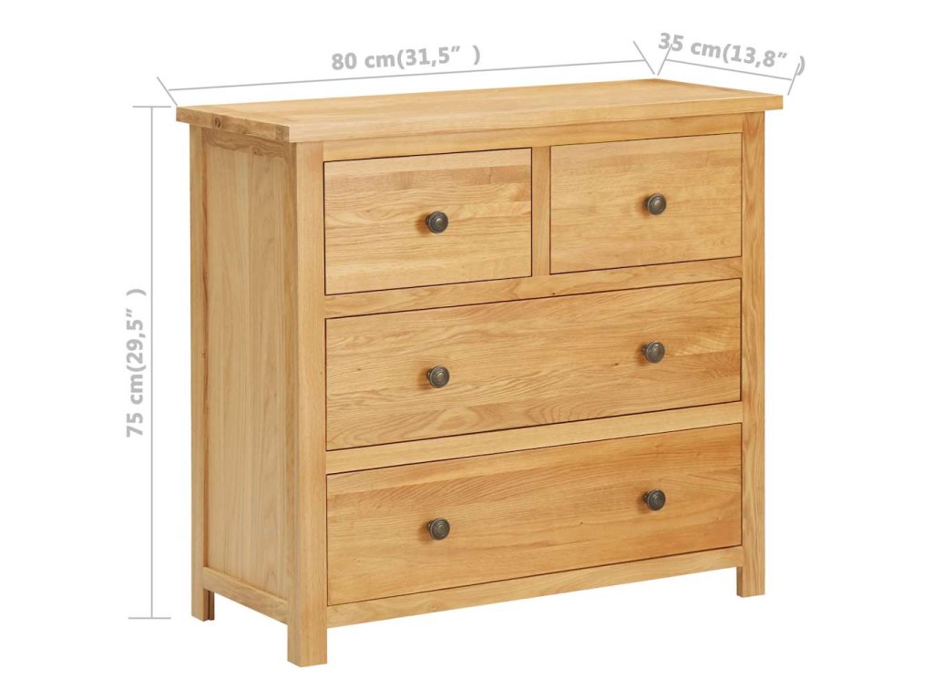 Naše komoda se zásuvkami je vyrobená z masivního dubového dřeva s přírodním povrchem. Pokud chcete prodloužit životnost dřeva, doporučujeme ho ošetřit dubovým olejem nebo jiným prostředkem na vodní bázi. Stabilní horní deska komody vám nabídne dostatek prostoru pro odkládání nápojů či pro mísu s ovocem a dekorativní předměty atd. Dostatek úložného prostoru pro vaše oblečení a malé předměty najdete ve dvou malých zásuvkách a dvou velkých zásuvkách.