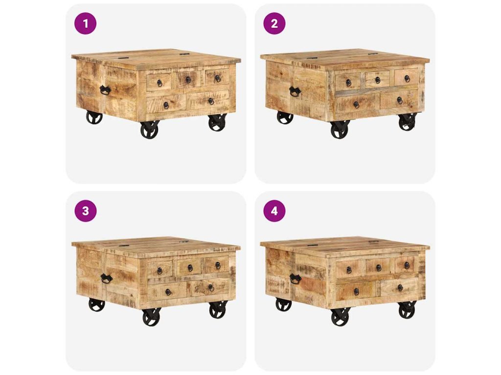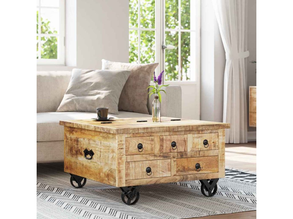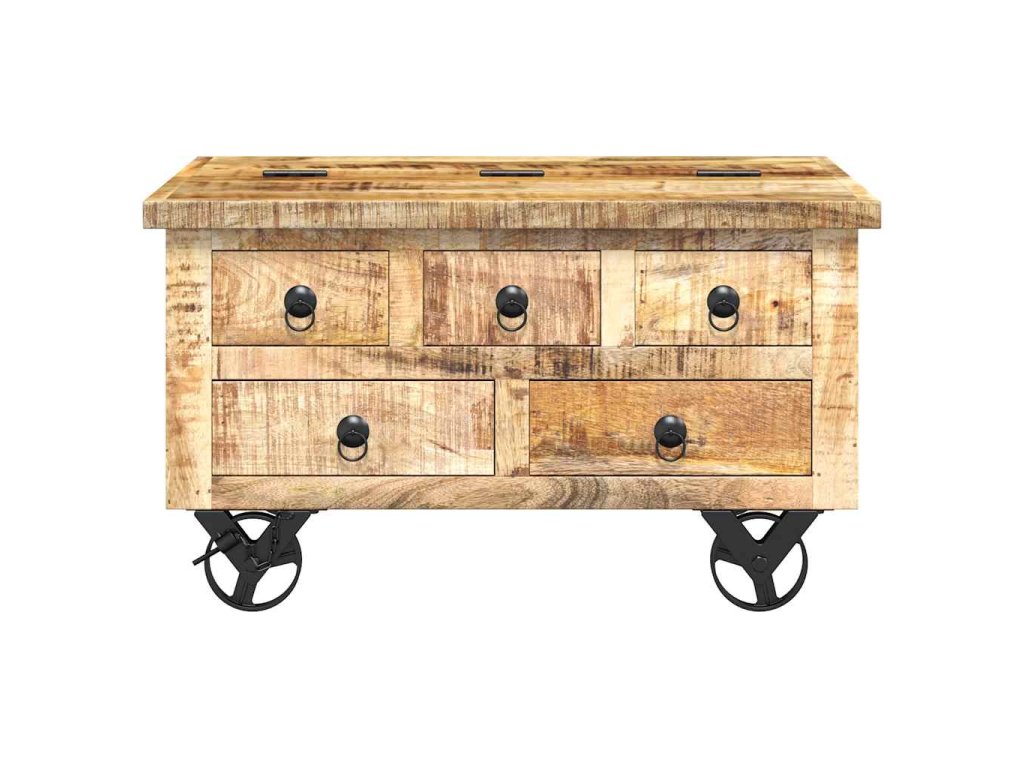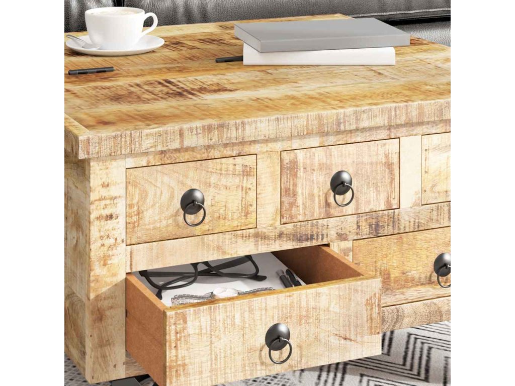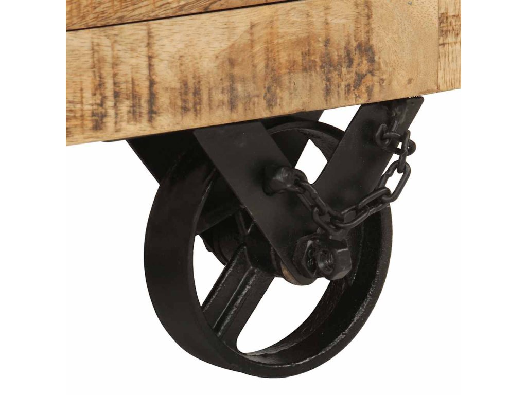 Konferenční stolek je ručně vyrobený z masivního hrubého mangovníkového dřeva, které je robustní a stabilní, a řemeslné zpracování přispívá k jeho velkolepému retro stylu. Každá fáze výrobního procesu se provádí s největší péčí, ať už se jedná o leštění nebo lakování. Zručné řemeslné zpracování a krásná kresba dřeva propůjčuje každému kusu nábytku jeho jedinečný a od všech ostatních lehce odlišný vzhled. Navíc 5 zásuvek a velká vnitřní přihrádka poskytují dostatek prostoru pro všechny věci, které chcete mít na dosah ruky. Stolek je vybaven 4 železnými kolečky, která usnadňují pohyb a zvýrazňují industriální vzhled.