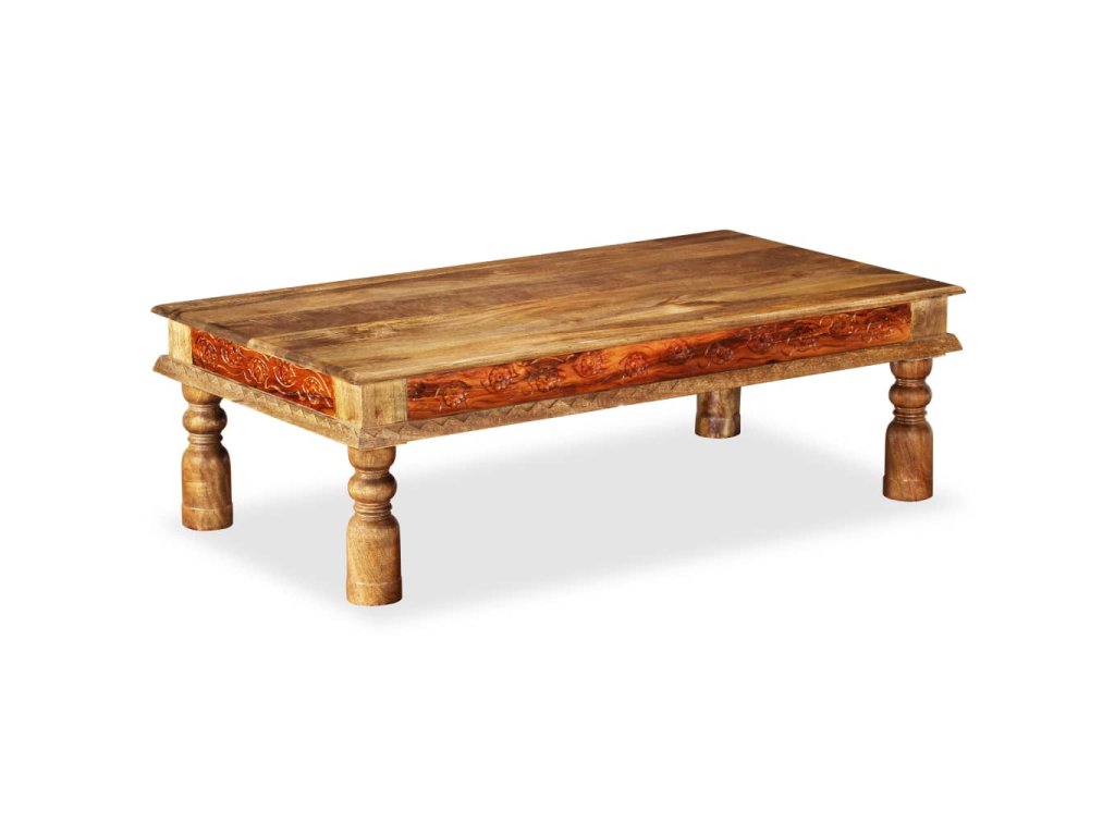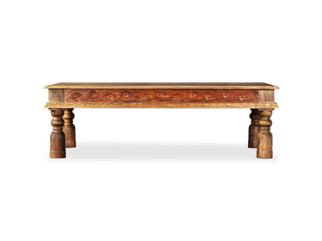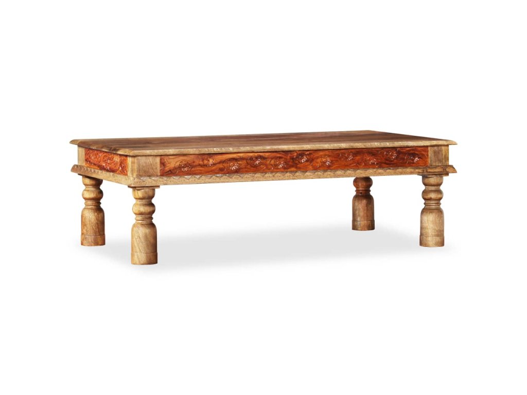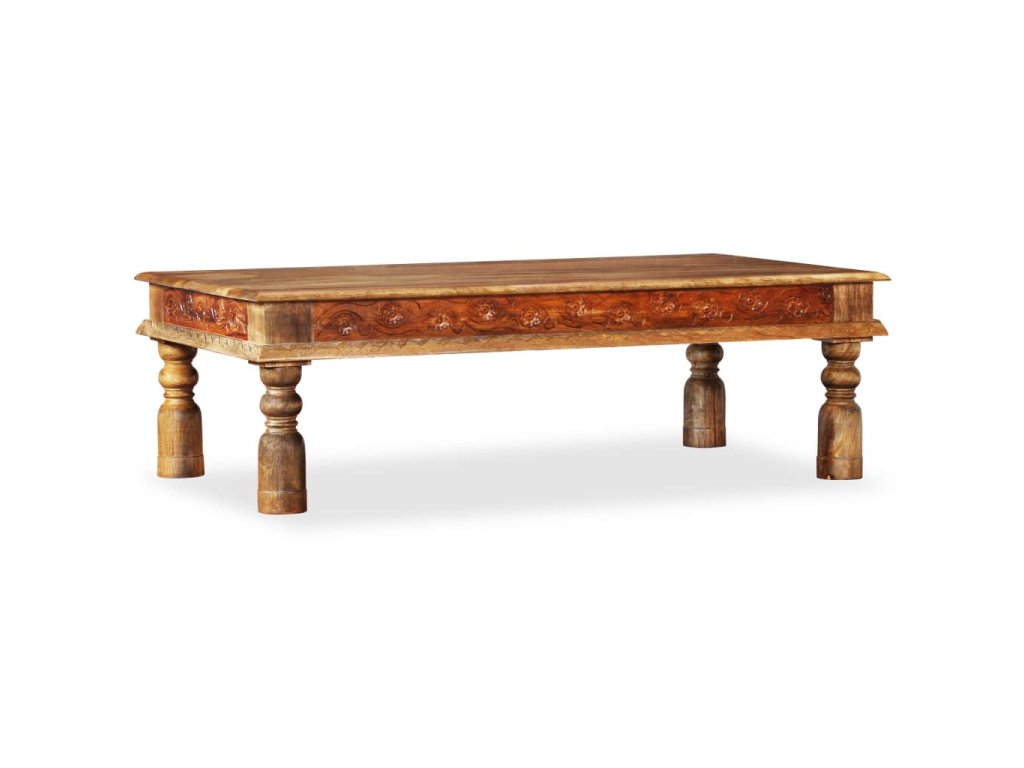 Konferenční stolek, vyrobený z masivního mangovníkového a akáciového dřeva, je stabilní, odolný a velice nenáročný na údržbu. Akácie, jemuž se někdy také říká palisandr nebo rosewood, je tropické tvrdé dřevo, které je proslulé svou bohatou kresbou. Svrchní deska je ideální pro vystavení dekorativních předmětů, jako jsou košíky s ovocem, vázy anebo květináče. Vyřezávané květinové vzory dodávají stolku starožitné kouzlo. Každá fáze výrobního procesu je prováděna s největší pečlivostí, ať už se jedná o leštění, natírání nebo lakování. Montáž je snadná.