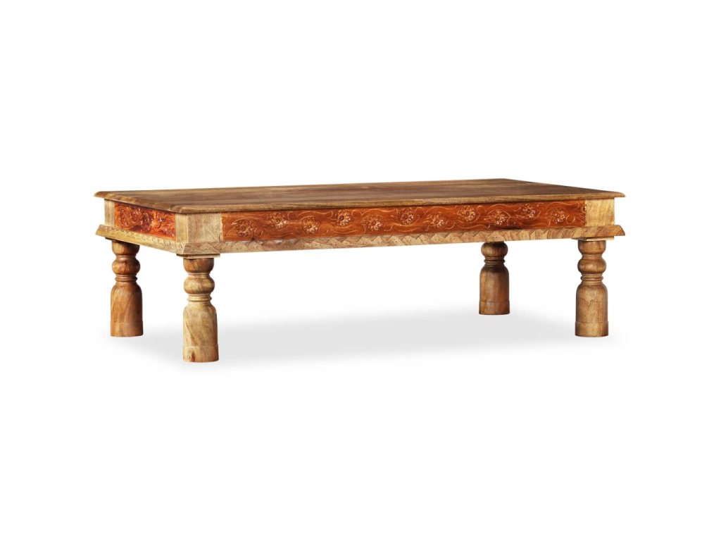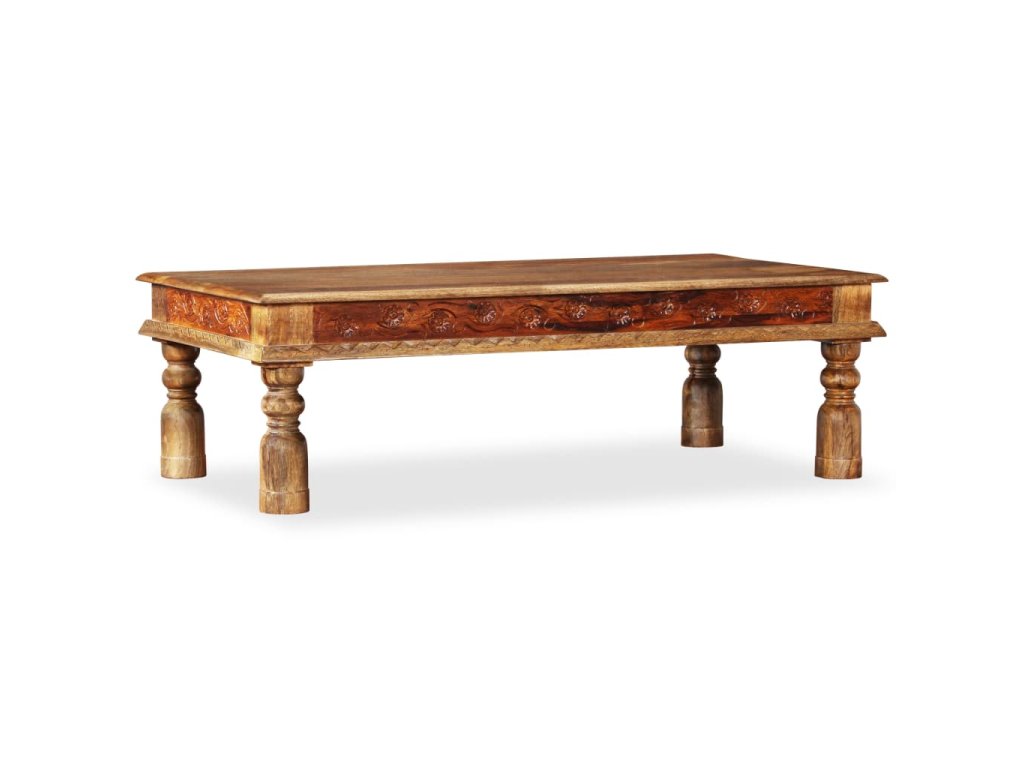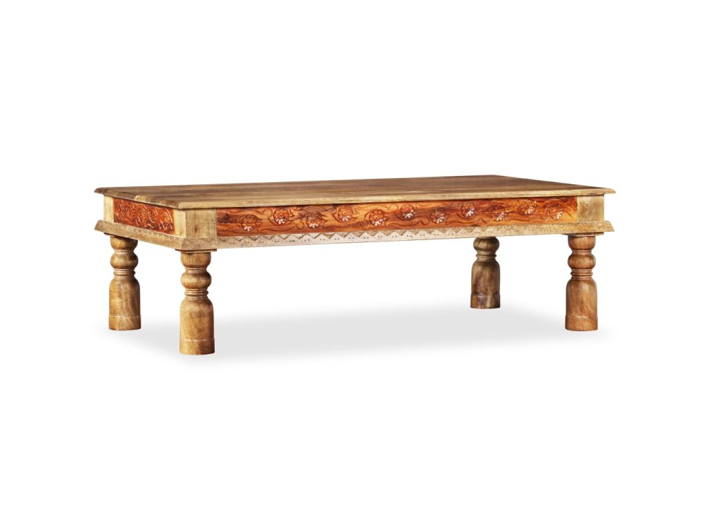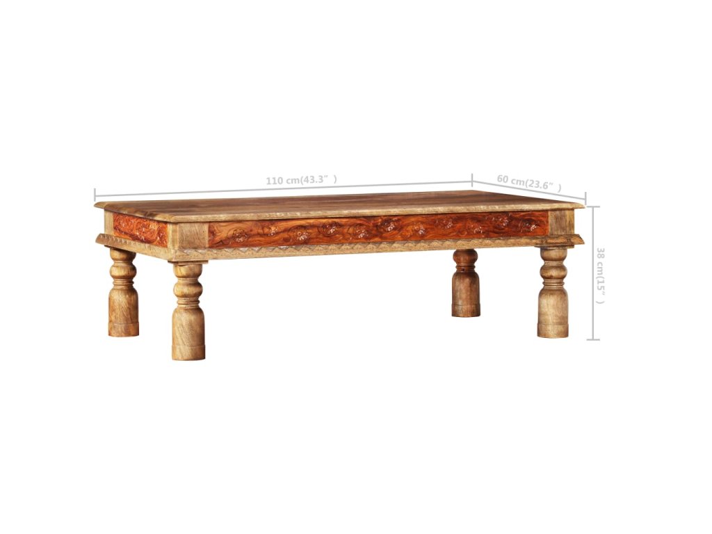 Konferenční stolek, vyrobený z masivního mangovníkového a akáciového dřeva, je stabilní, odolný a velice nenáročný na údržbu. Akácie, jemuž se někdy také říká palisandr nebo rosewood, je tropické tvrdé dřevo, které je proslulé svou bohatou kresbou. Svrchní deska je ideální pro vystavení dekorativních předmětů, jako jsou košíky s ovocem, vázy anebo květináče. Vyřezávané květinové vzory dodávají stolku starožitné kouzlo. Každá fáze výrobního procesu je prováděna s největší pečlivostí, ať už se jedná o leštění, natírání nebo lakování. Montáž je snadná.
