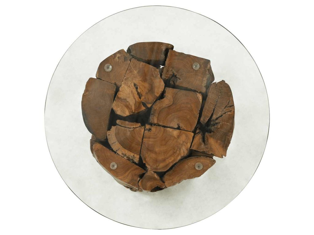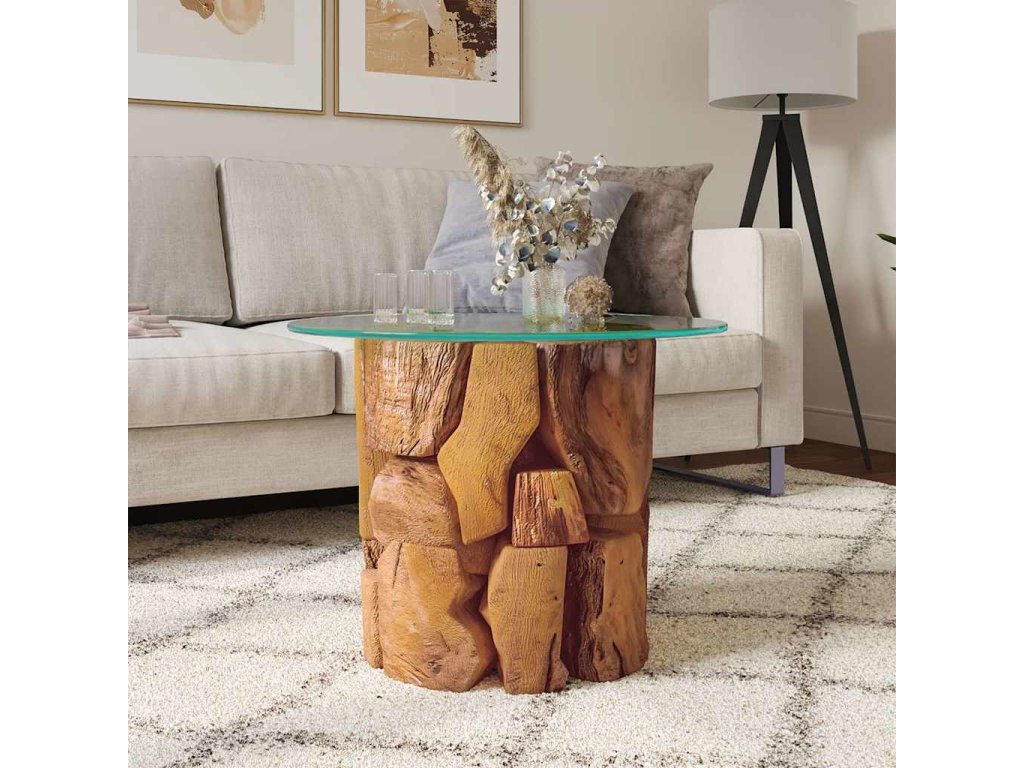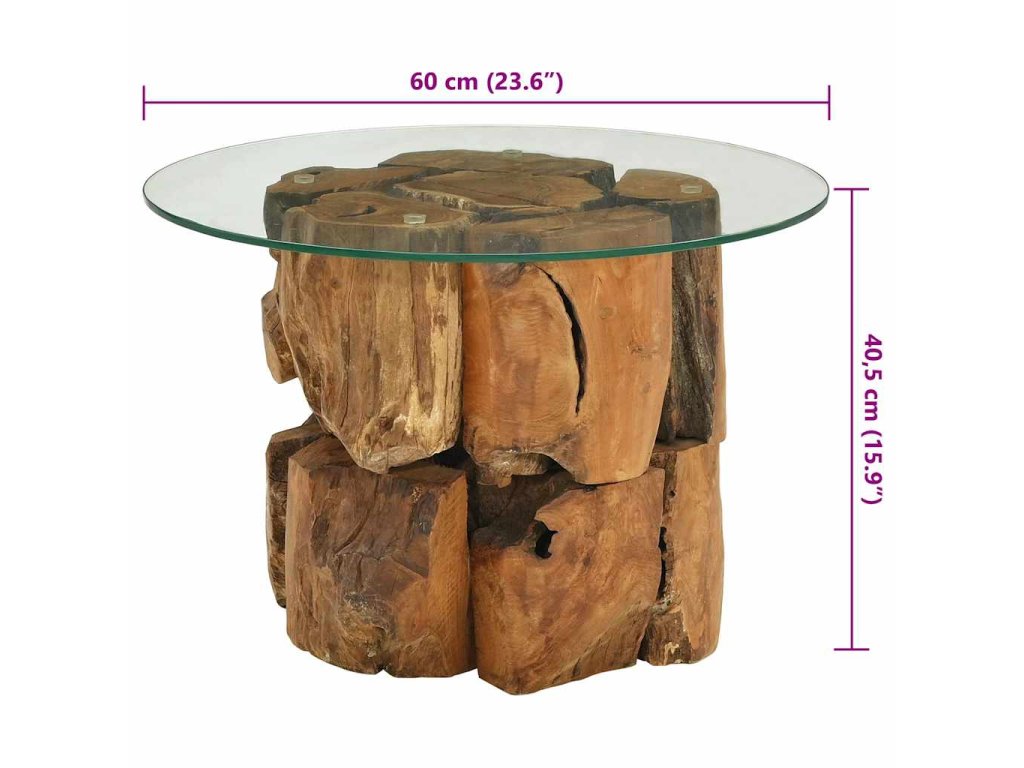 - Materiál: podstavec z masivního naplaveného teakového dřeva + stolní deska z tvrzeného skla