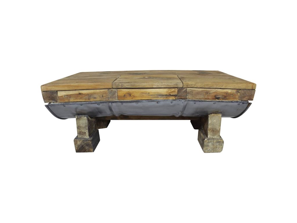 Svrchní deska a nohy stolku jsou vyrobené z masivního recyklovaného dřeva, které má vlastnosti různých typů dřeva, jako je mahagon, teak, mangovník, akácie atd. Recyklovaný sud z galvanizovaného železa stolek ještě víc zpevňuje a dodává mu robustní, industriální vzhled. Je možné, že ve stolku objevíte díry po hřebících, šroubech či západkách nebo jiné stopy, které svědčí o minulosti a také autenticitě materiálu. Žádná z těchto stop nevznikla záměrně, a proto z nich můžete vyčíst bohatou historii dřeva, které pochází například z popadaných stromů, dřevěných lodí či domů. Každý kus je jedinečný a lehce se liší od ostatních kusů. Známky opotřebení a perfektní rukodělné zpracovaní jsou zárukou unikátního vzhledu každého kusu, který ještě víc zdůrazňuje jeho pozoruhodný vintage styl.