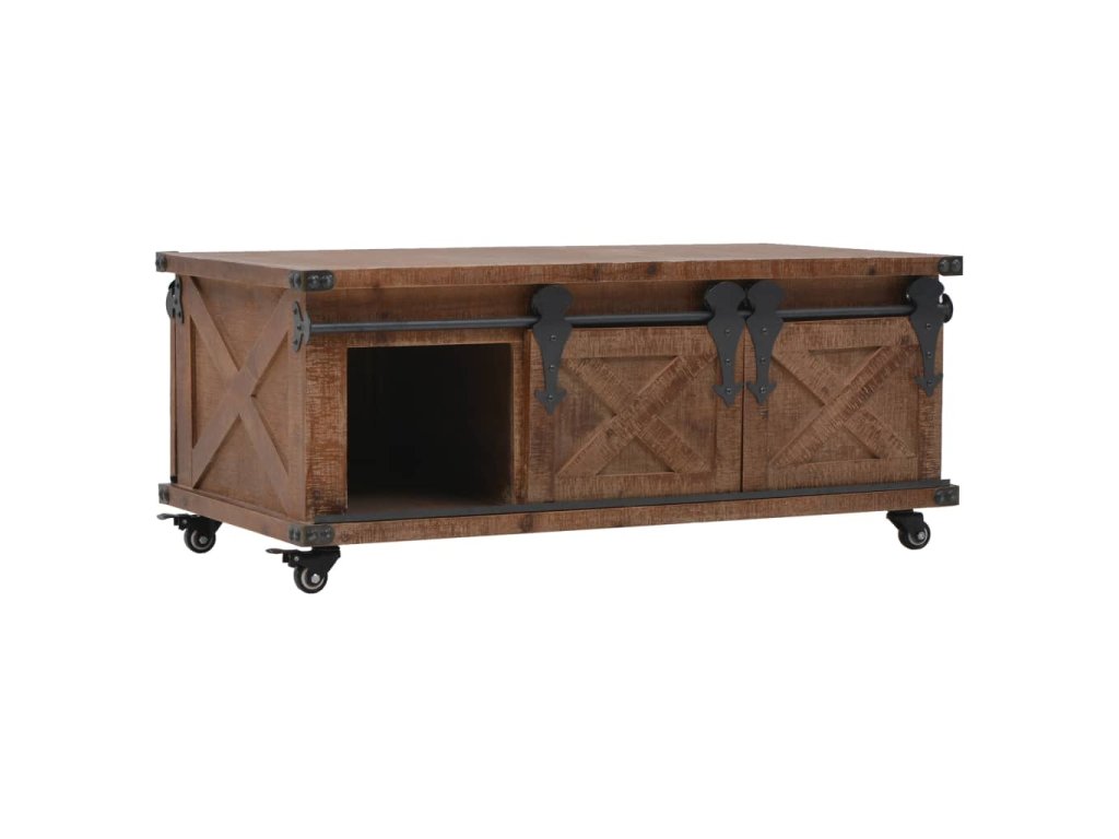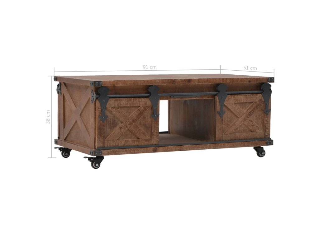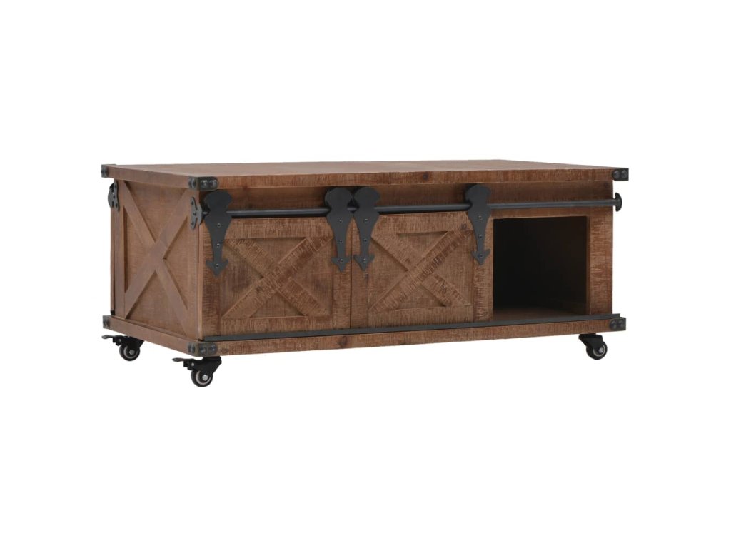 Vysoce stabilní a odolný odkládací stolek je vyrobený z masivního jedlového dřeva, jež vyzařuje půvabné vintage kouzlo a dodává stolku rustikální rysy. Pevná horní deska je ideální pro vystavování košíků s ovocem, váz nebo jiných dekorativních předmětů. Konferenční stolek vám poskytne spoustu místa pro přehledné uspořádání vašich nejrůznějších potřeb. Jedinečný posuvný design umožňuje snadné otevírání a zavírání dvířek a zároveň podtrhuje industriální vintage styl nábytku. Stolek je vybaven čtyřmi flexibilními kolečky, můžete ho tedy bez obtíží přesouvat po celém domě.